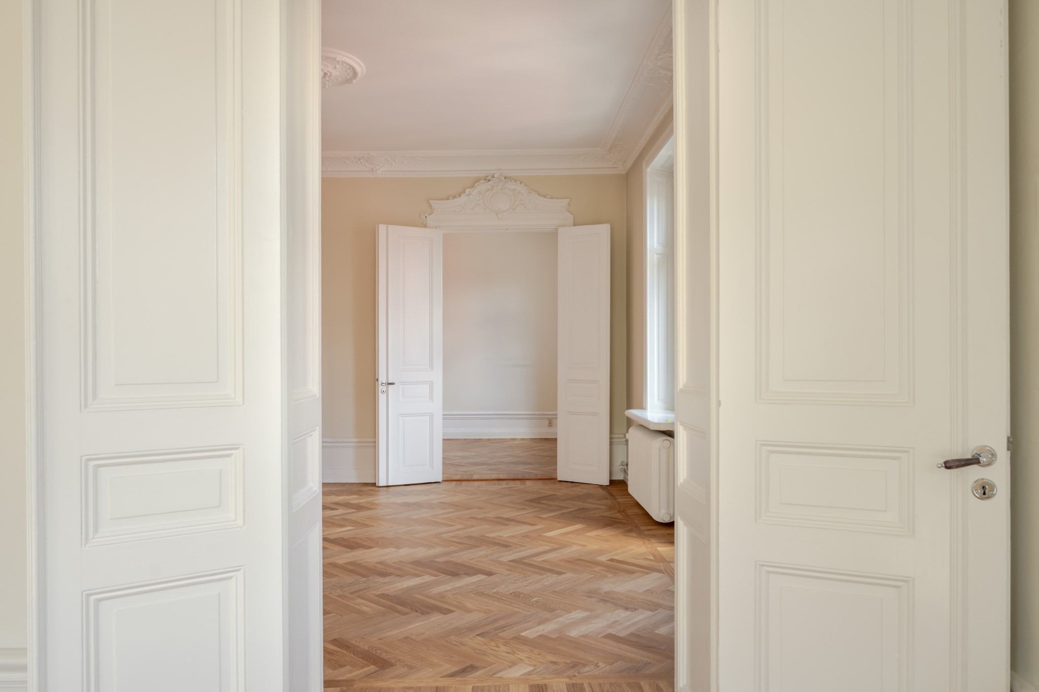 Välkomnande hall med förvaringsmöjligheter. Genomgående högt i tak och vackra stuckaturer.