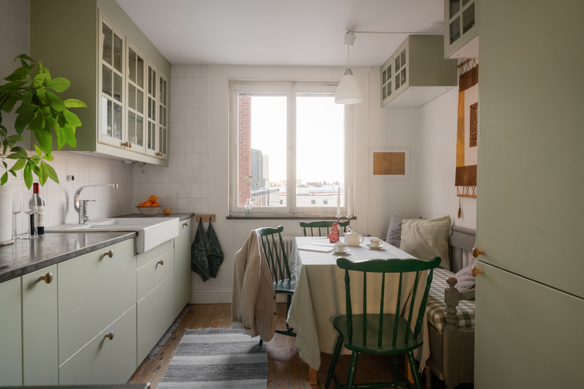 Stora fönsterpartier ger ett härligt ljusinsläpp med fri utsikt över den mysiga och prunkande innergården, takåsar och blå himmel. Köket präglas av högsta funktion och charm. Det finns gott om plats för förvaring. De lindblomsgröna skåpen går ända upp till taket och gör sig fint mot bänkskivan i kalksten som erbjuder gott om arbets- och avlastningsyta. Den maskinella utrustningen består av induktionshäll, spisfläkt, inbyggd ugn, micro, integrerad diskmaskin samt kyl och frys. Vid matplatsen finns det plats för ca 6 personer. Vitkaklat ovanför arbetsytor, väggarna är vitmålade och på golvet återfinns det vackra trägolvet.
