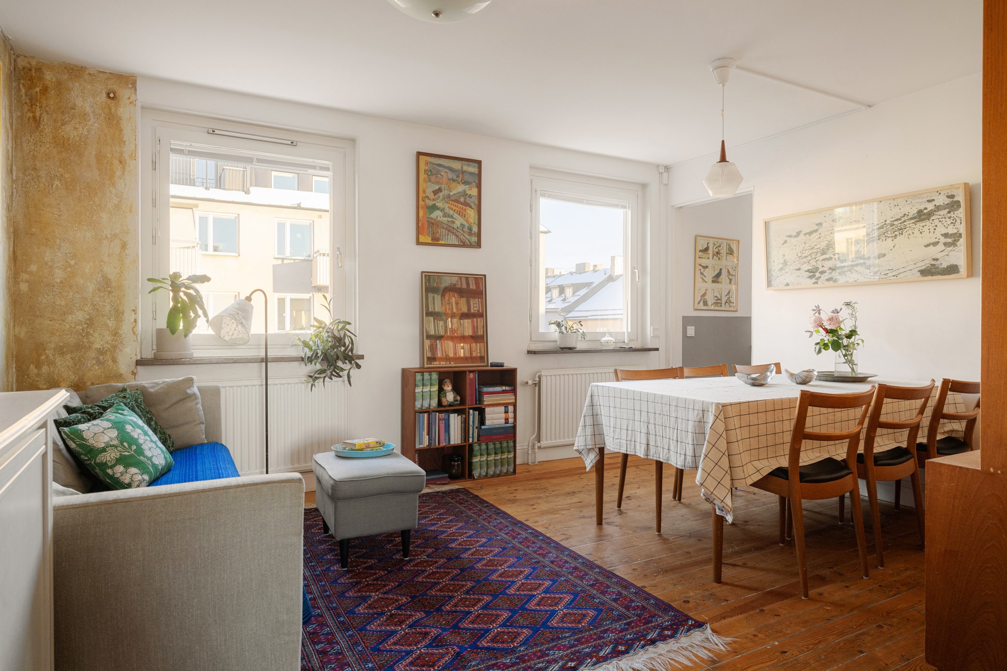 Genom en stor öppning i hallen som skapar en fin kontakt mellan rummen når man vardagsrummet. Två stora fönsterpartier skapar rymd och bjuder på en vacker utsikt över takåsarna där Sofias kyrktorn tronar upp sig i bakgrunden. Rummet är väldisponerat med plats för soffhörna och matbord. Väggarna är vitmålade och ackompanjeras av en rustik fondvägg.
