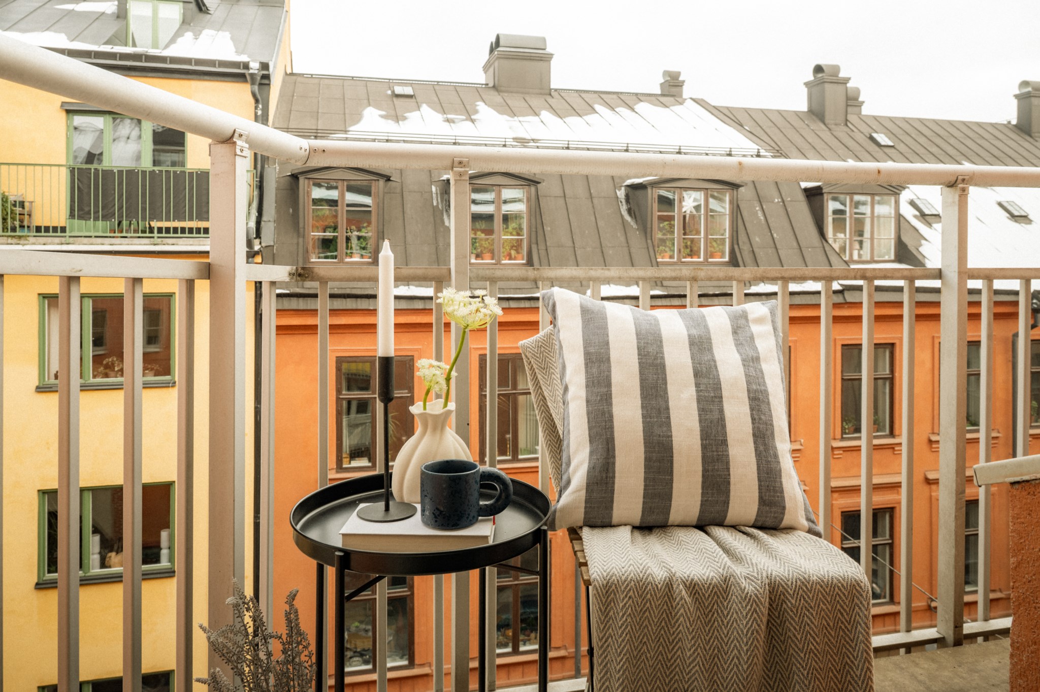 Balkong i öst med plats för bord och stolar. Fin stadsutsikt över Repslagargatan och vackra fastigheter.