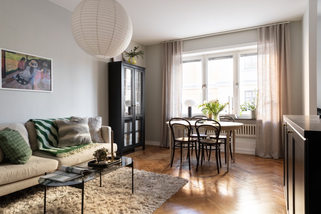 Luftigt och socialt vardagsrum i öppen planlösning mot köksdelen. Väl genomtänkt planlösning med plats för både soffgrupp och matbord för 4–6 personer. Vackra och höga spröjsade dubbeldörrar i svart trä som leder ut till balkong. Ljuspigmenterad fiskbensparkett, ljusmålade väggar och takrosett ger ett varmt och harmoniskt intryck.