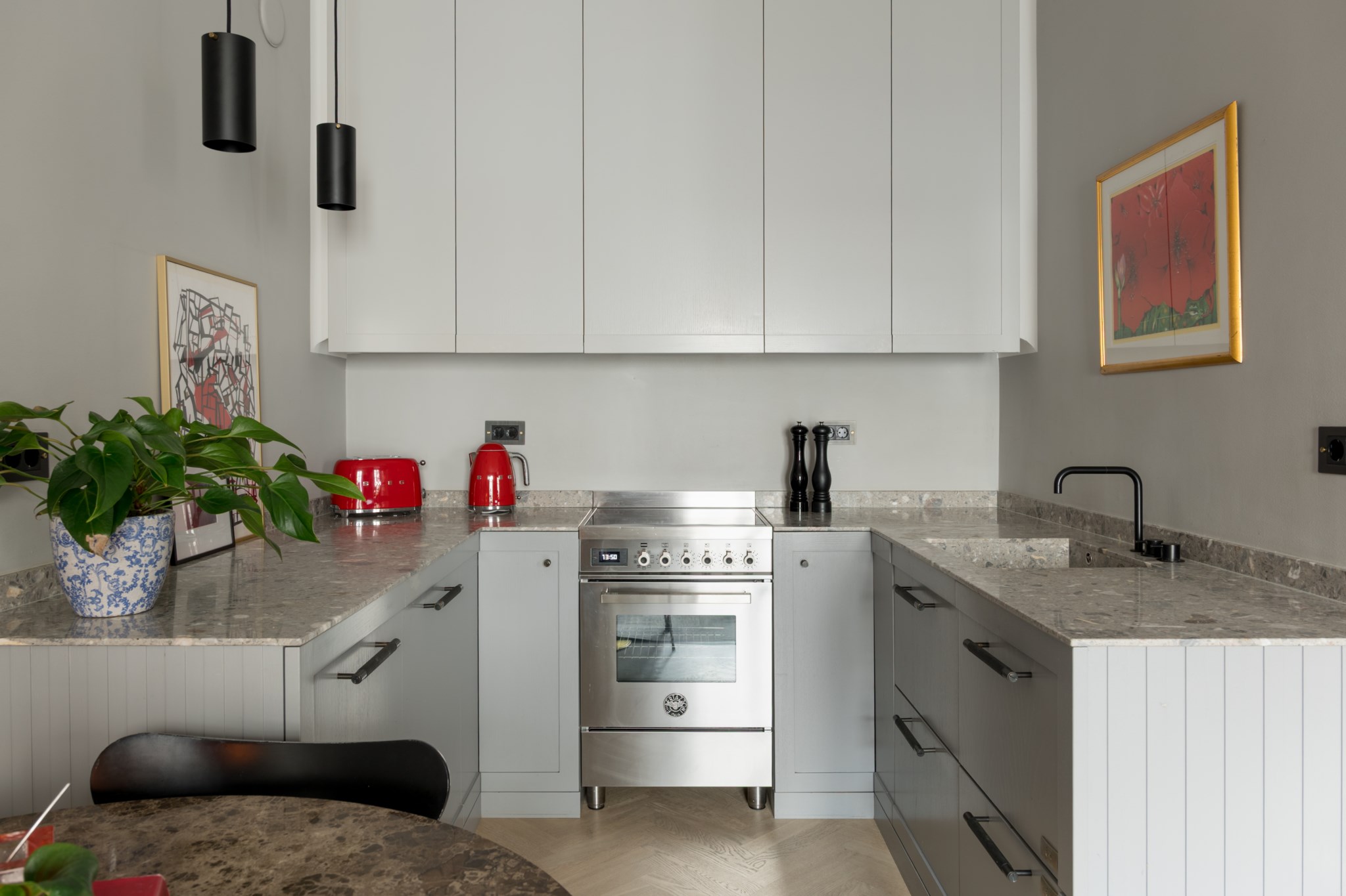 Platsbyggt kök från Inneform som är både estetiskt och funktionellt. Vacker belysning runt skåpens ljusgrå luckor samt beslag från Buster & Punch. Elegant terrazzobänkskiva i stenmaterial som även går upp som stänkskydd och i lyxig integrerad diskho. Hög design på maskiner med påkostad spis med induktionshäll och ugn från Bertazzoni, två integrerade utdragbara kylskåp, varav ett med frysfack från Liebherr samt diskmaskin.