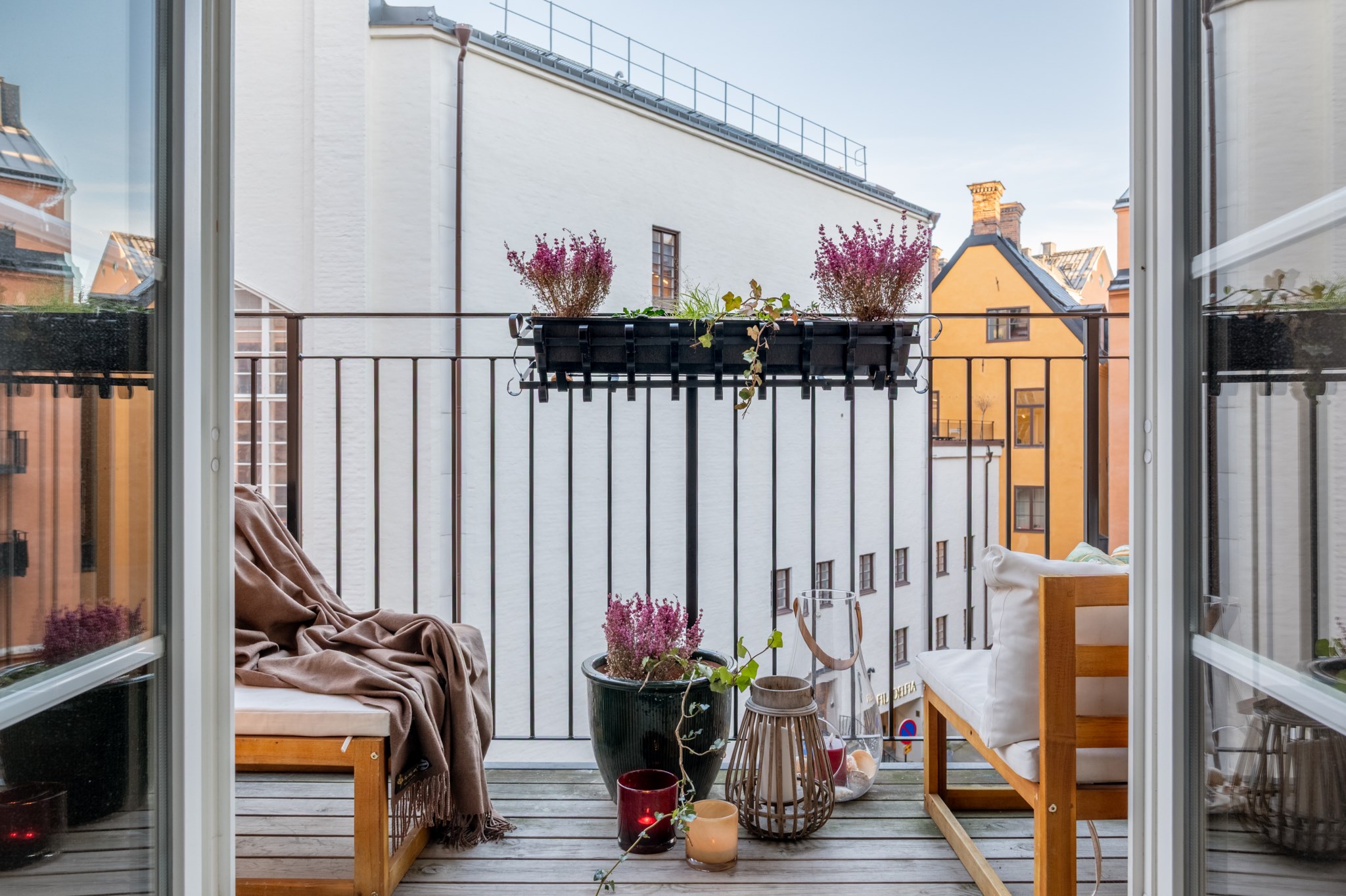 Balkong med fritt läge i sydöst med svarta smidesräcken, placering mot en lugn och enkelriktad mindre gata. Möblerbar för både bord, stolar och växter, en perfekt plats för morgonkaffet eller kvällens avkoppling.