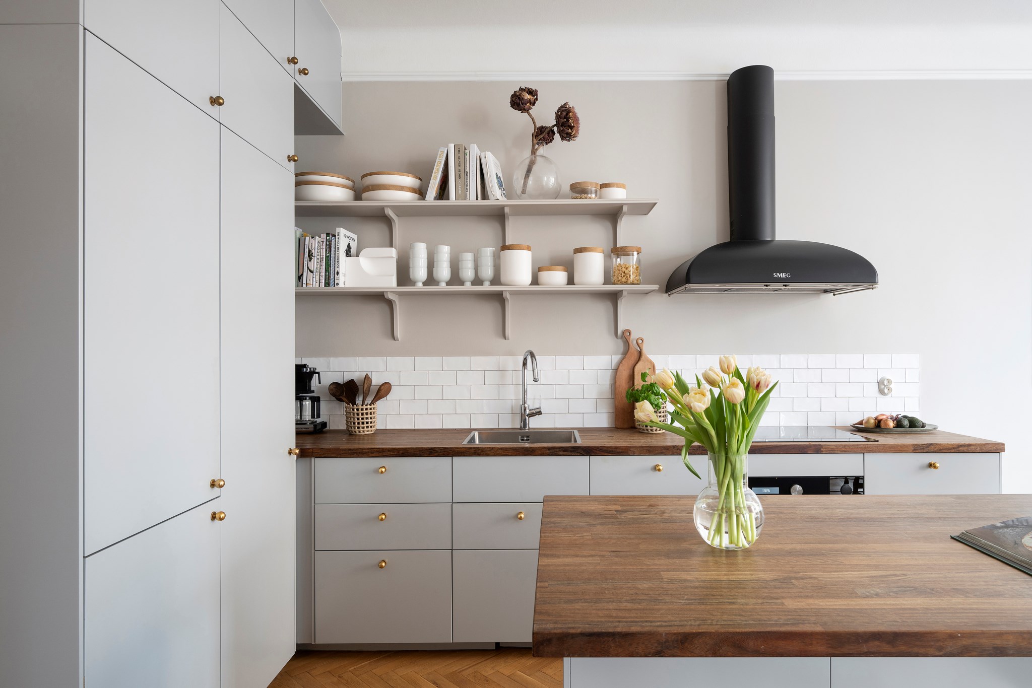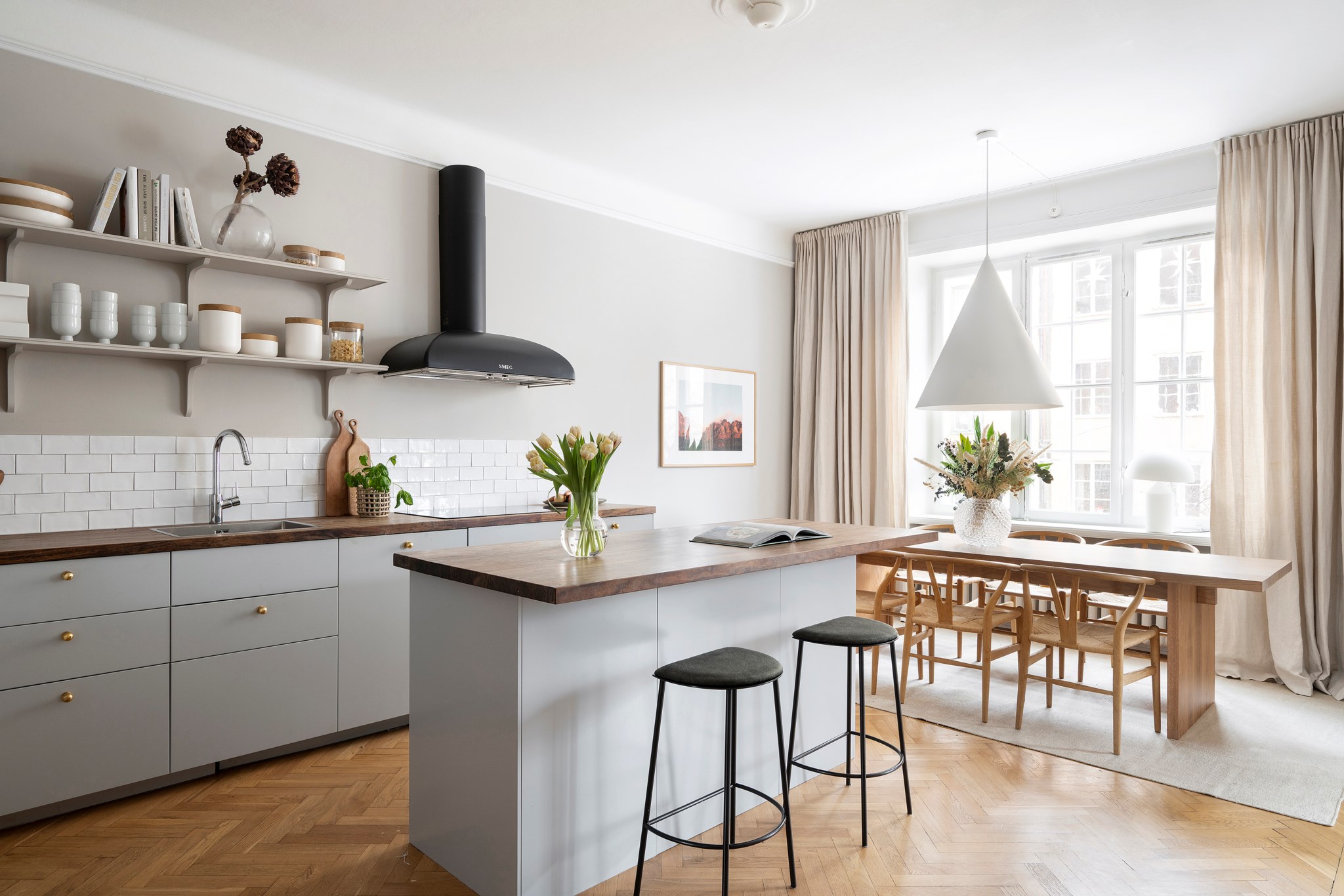 Köket renoverades 2019 och är både funktionellt och socialt utformat. En generös köksö skapar extra arbetsyta och erbjuder sittplatser för barstolar – perfekt för frukost, mingel eller läxläsning. Vid fönstret finns plats för ett större matbord. Köket erbjuder god förvaring, arbetsvänliga ytor och ett lugnt, modernt uttryck som samspelar fint med bostadens äldre detaljer.
