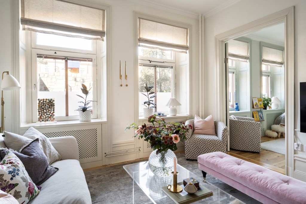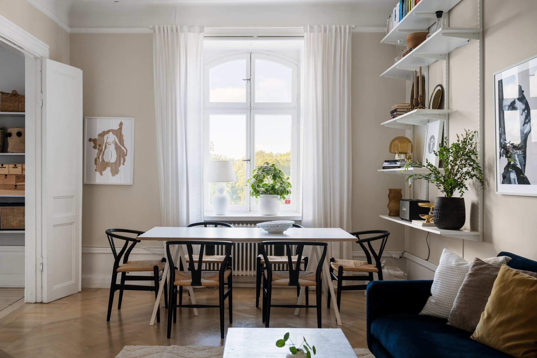 Ljust och spatiöst sällskapsrum med plats för både större soffgrupp samt en matsalsmöbel för flertalet middagsgäster. Stort välvt fönster med extra djup nisch vetter ut mot den lugna delen av Rörstrandsgatan och ger ett härligt ljusinsläpp. Från fönstret blickar man ut över Karlbergs slott och här kan man njuta av otroliga solnedgångar.