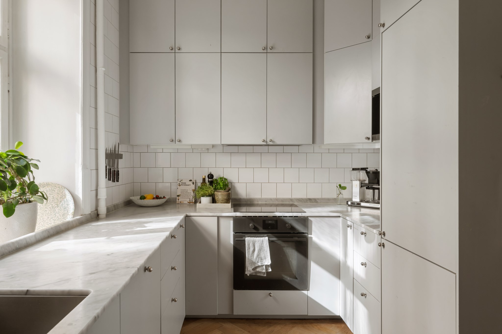 Stilrent renoverat kök med hög standard och smakfulla materialval. Takhöjden utnyttjas genom rymliga skåp upp till tak. Bra arbetsbänkar av Carrara-marmor med nedsänkt ho samt vitt klassiskt kakel. Full maskinell utrustning bestående av induktionshäll, integrerad diskmaskin, integrerad kyl/frys, inbyggnadsugn- och mikro samt en inbyggd kolfilterfläkt. Här finns även ett fönster som genererar ett fint ljusinsläpp.