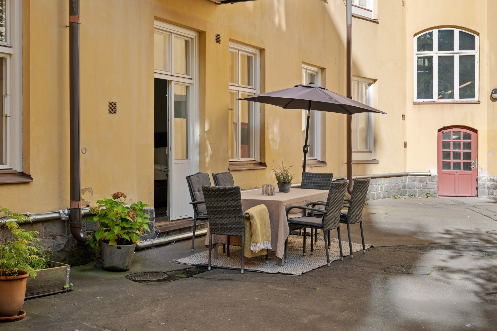 Det finns en trevlig innergård med sittplatser, träd/växter och grill.