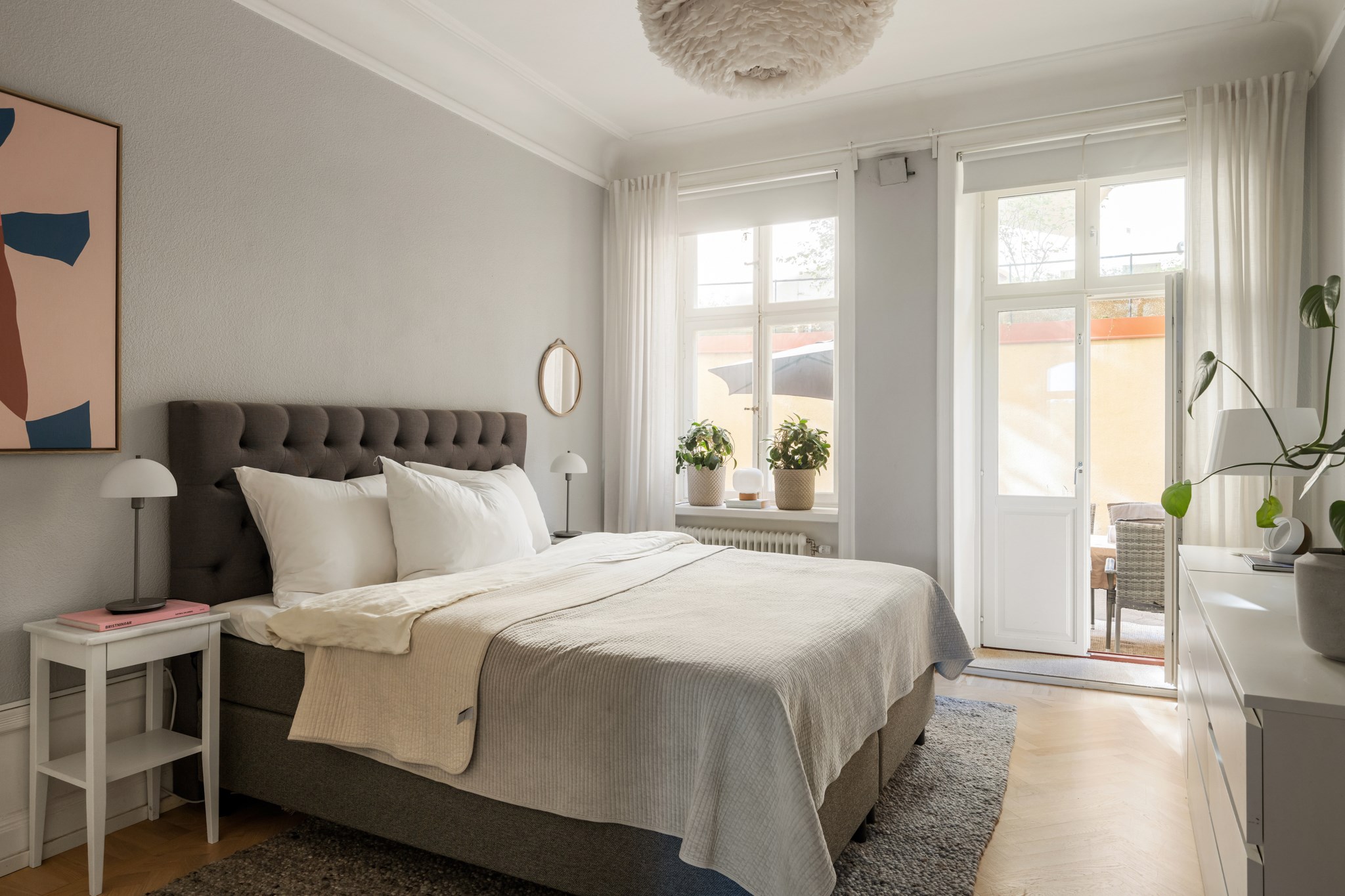 Mot gård ligger det rofyllda och väl tilltagna sovrummet. Från sovrummet har man utgång via dubbeldörrar till lägenhetens uteplats med förmiddagssol som rymmer sittgrupp och planteringar. Rummet har en härlig atmosfär och erbjuder gott om plats för större dubbelsäng, sängbord samt annan valfri sovrumsmöbel. Här finns två dubbelgarderober.