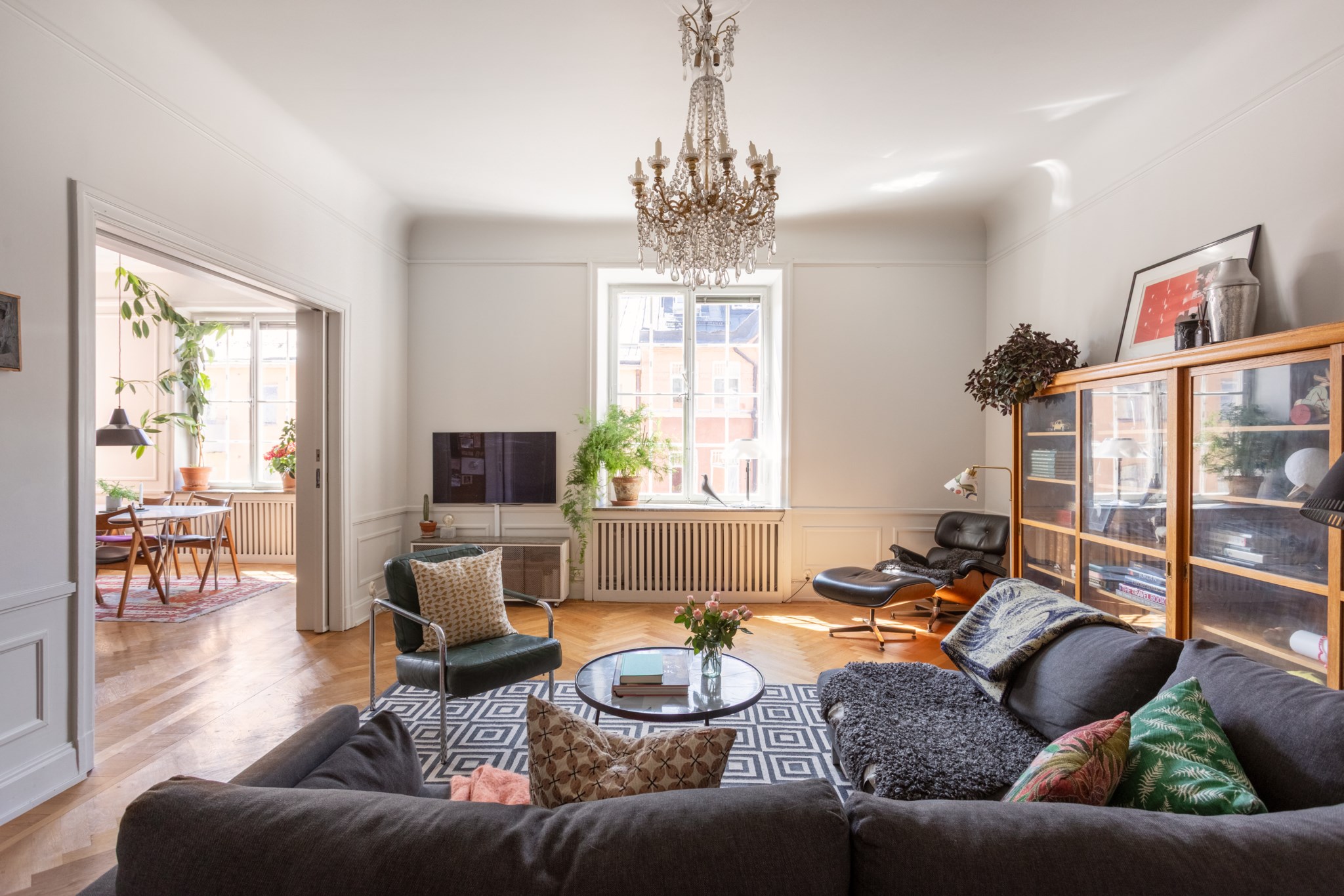 På Roslagsgatan, mitt i Vasastans omtyckta Sibirienkvarter, ligger denna generösa lägenhet om 120 kvm –högt upp på våning fyra i ett hus från 1918. Här möts man av ljus, rymd och en självklar pondus som bara riktigt välbevarade sekelskifteshem kan bära.