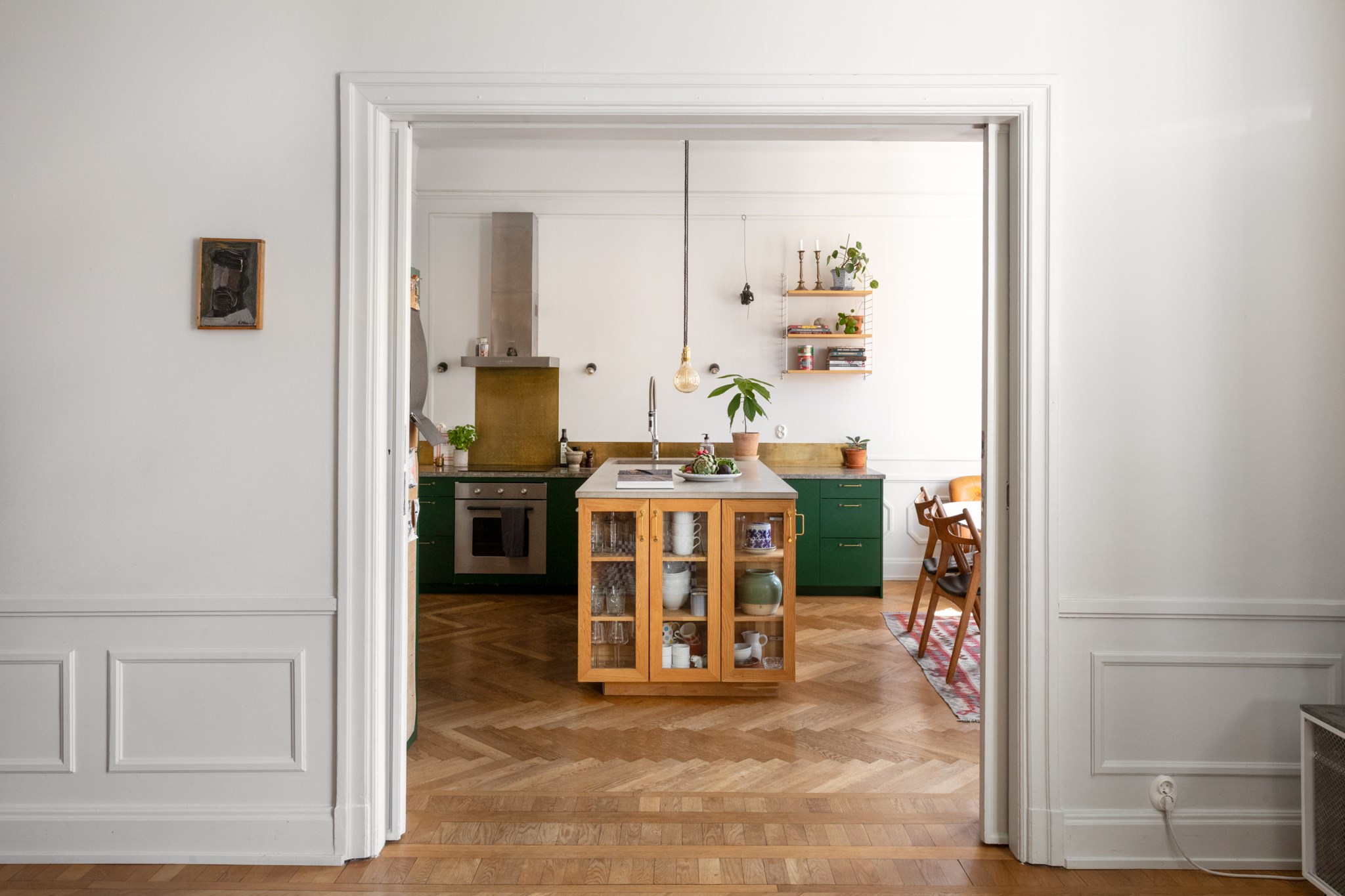 Redan i hallen välkomnar den fungerande öppna spisen, en mysig och varm detalj som sätter tonen direkt. Siktlinjen fortsätter genom bevarade skjutdörrar mot vardagsrum och vidare in i köket, där klassiska snickerier möter ett kök renoverat 2013 i tidlösa material. Gröna luckor, generösa arbetsytor och köksö skapar en naturlig samlingspunkt.