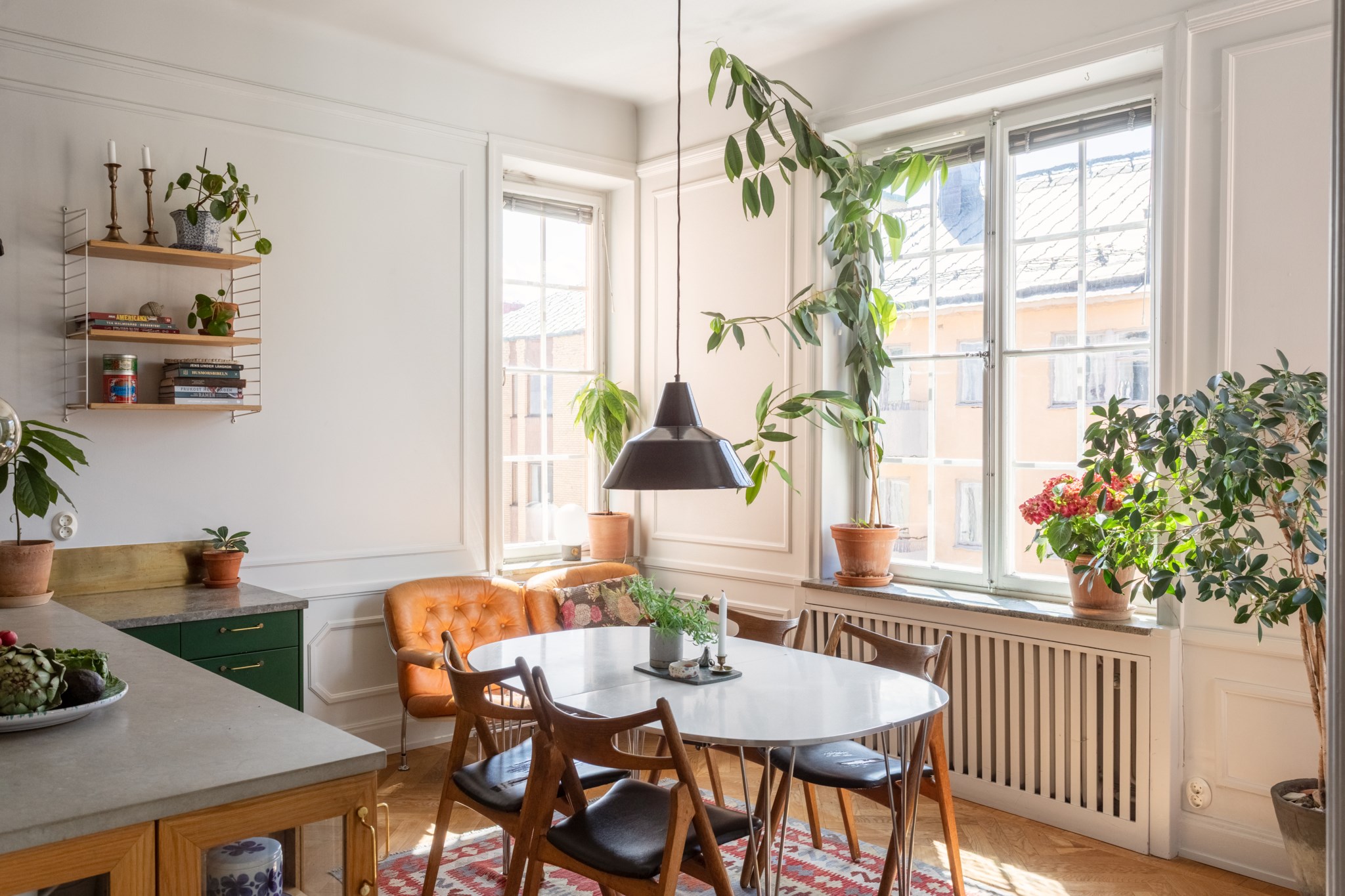 Vardagsrum och kök vetter mot Roslagsgatan och fylls av ett generöst ljus, med utsikt över staden och kyrktorn som ger vyerna en levande fond. De småspröjsade fönstren ramar in ljuset vackert, och tillsammans med höga bröstningar, takrosetter och den tilltagna takhöjden skapas en rymd som känns både självklar och storslagen. De fina golven binder samman rummen och låter det gamla och det nya mötas med varsam balans -en harmonisk helhet där arkitekturen får tala och hemmakänslan infinner sig.