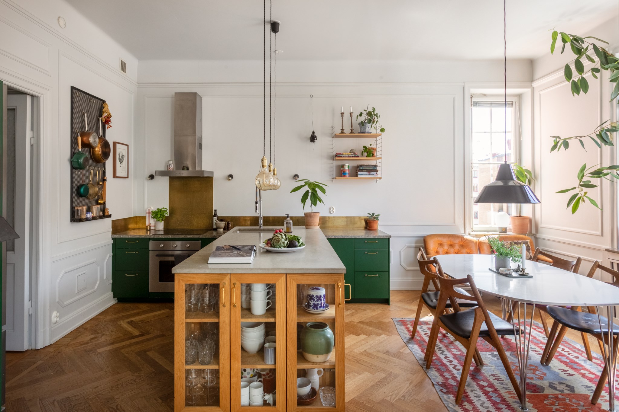 Köket renoverades 2013 i klassiska och hållbara material. Gröna luckor kombineras med arbetsbänkar i sten och generösa förvaringslösningar. Köksö med extra arbetsyta och förvaring. Gott om plats för stort matbord intill fönster med fint ljusinsläpp mot gatan. Bevarade snickerier och spröjsade fönster i tre väderstreck ramar in rummet.