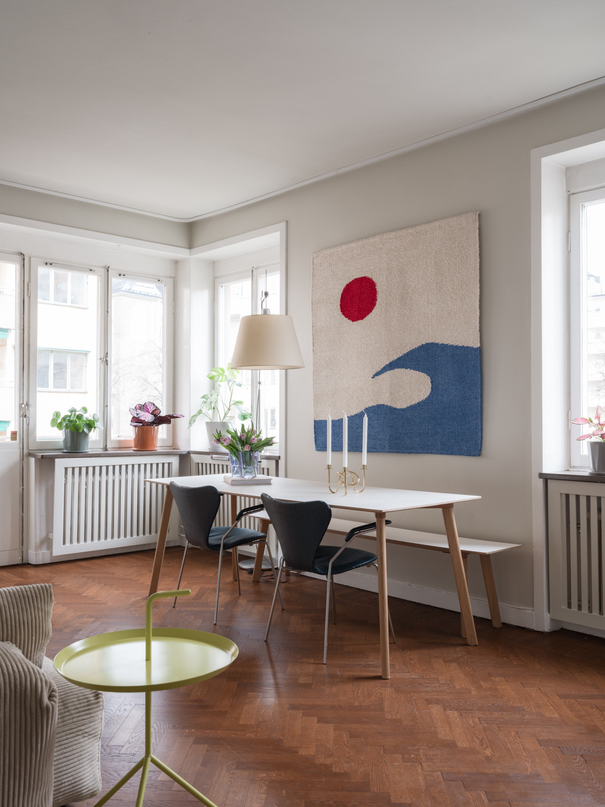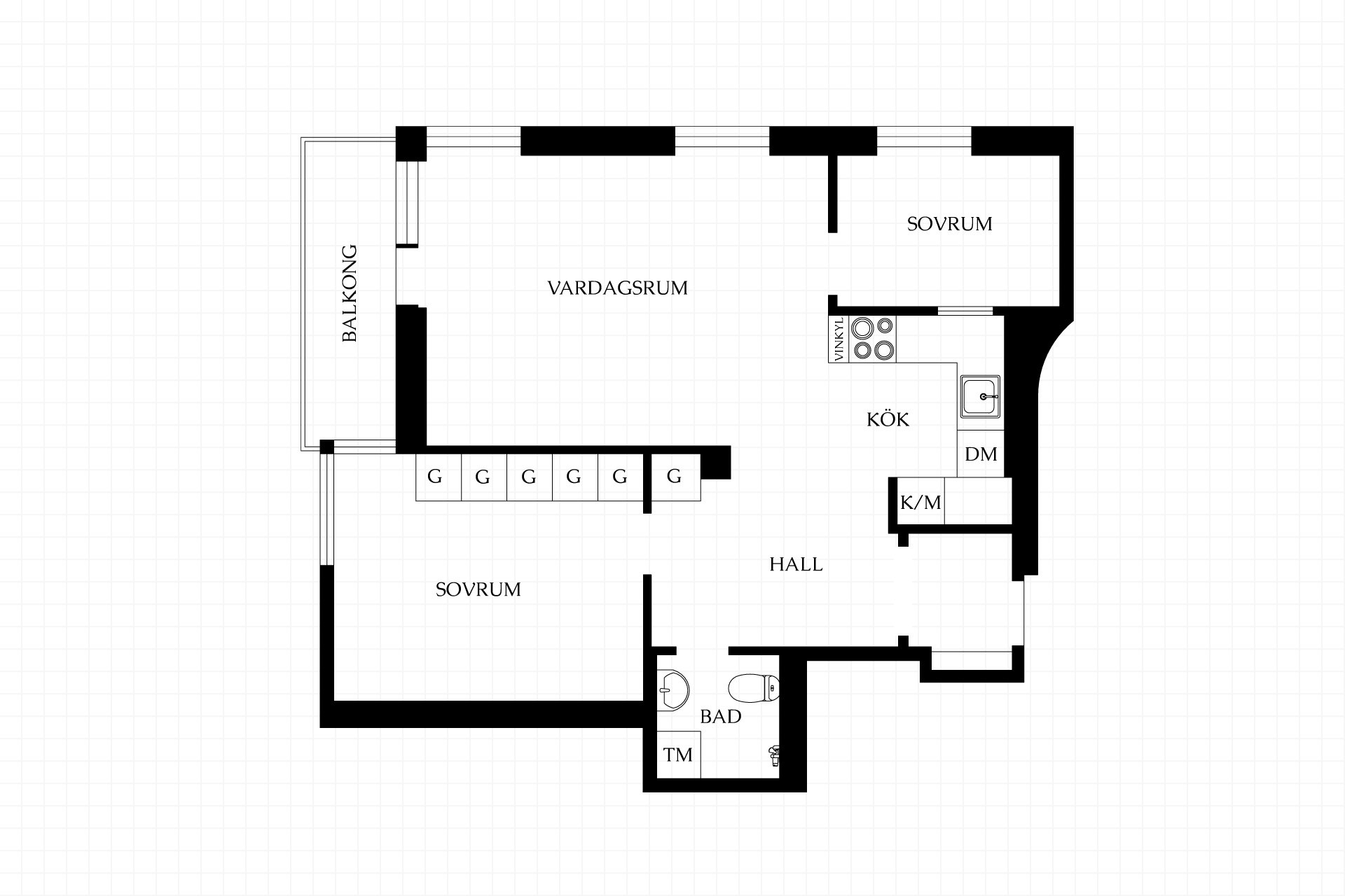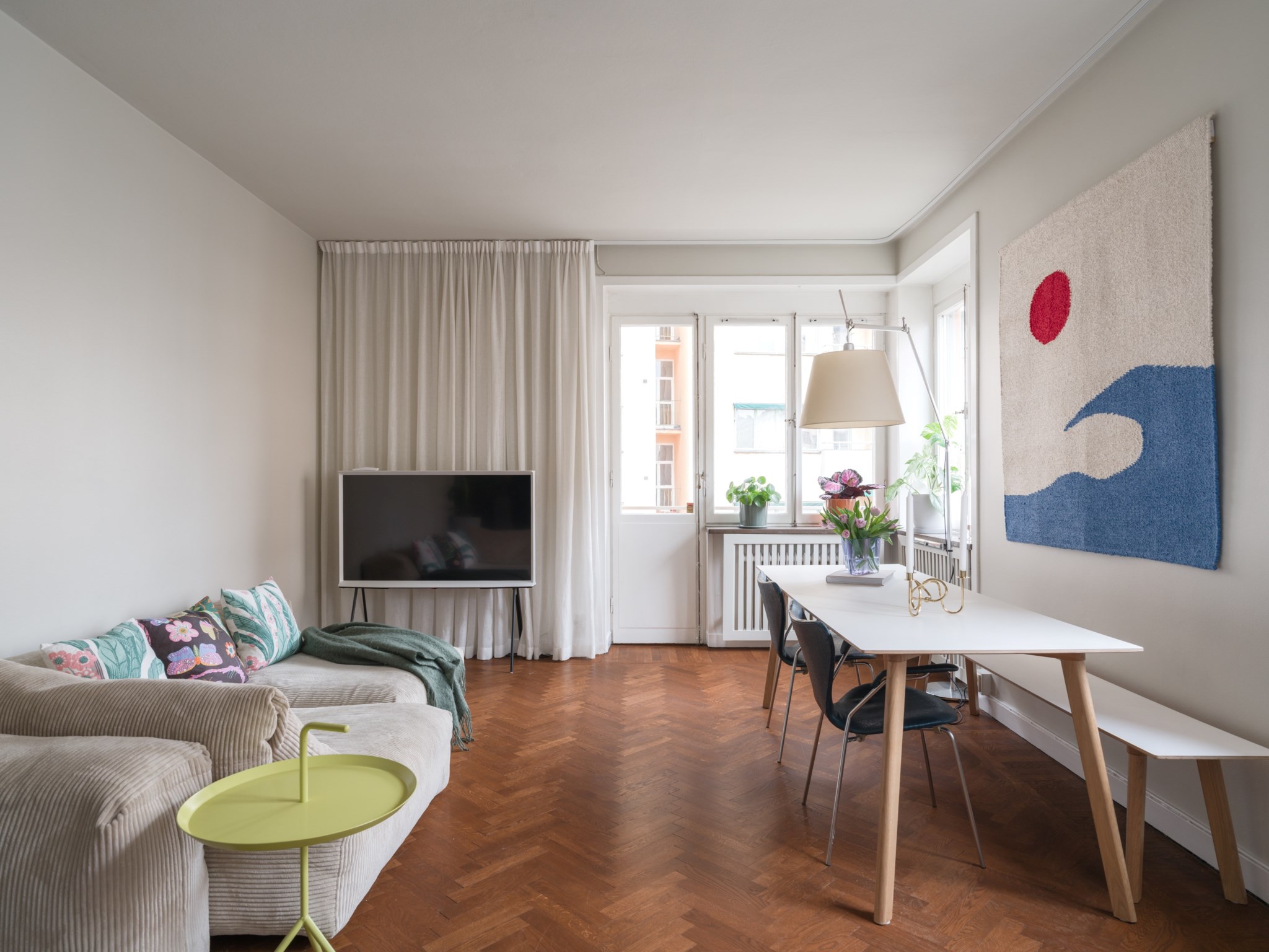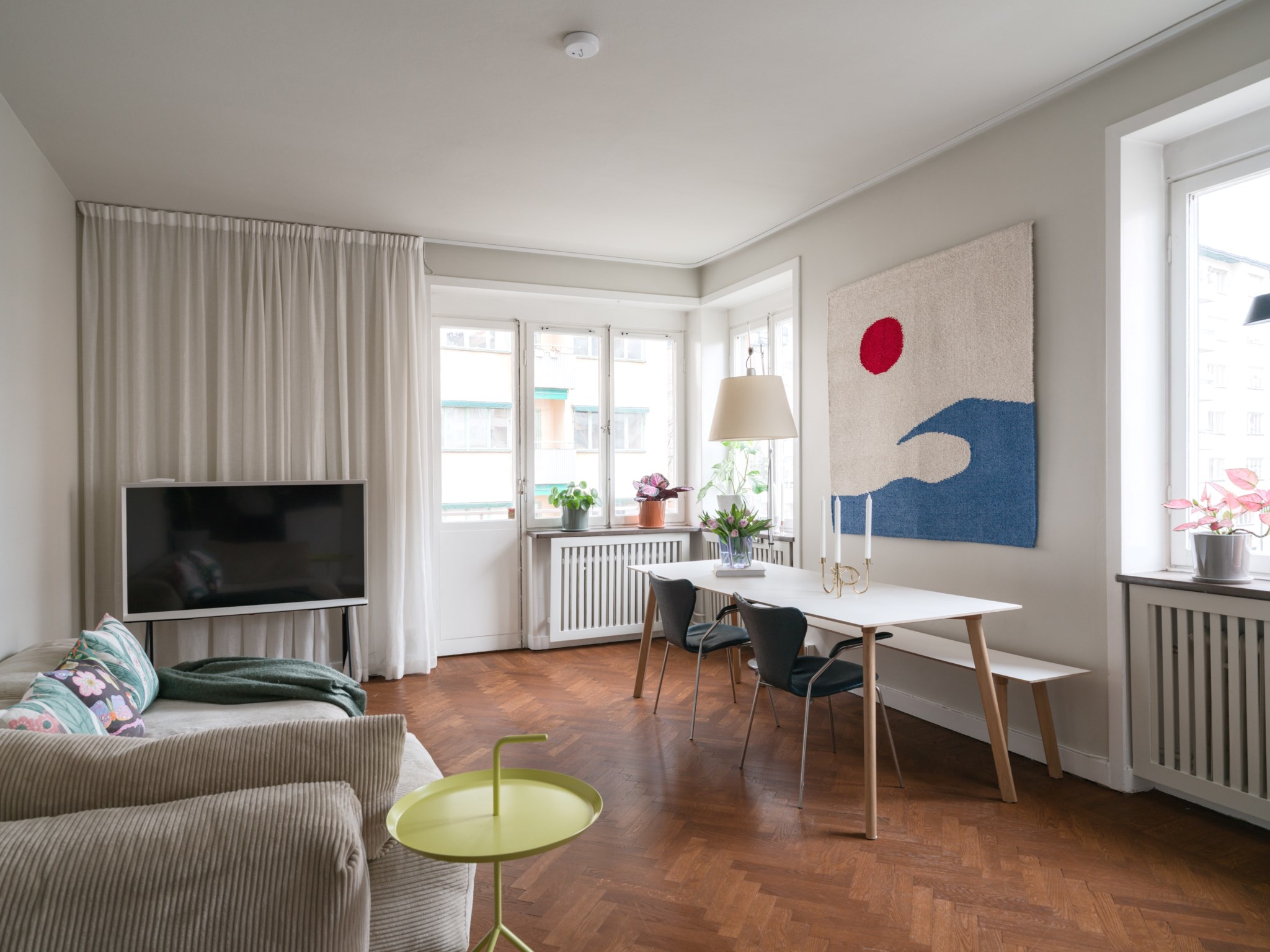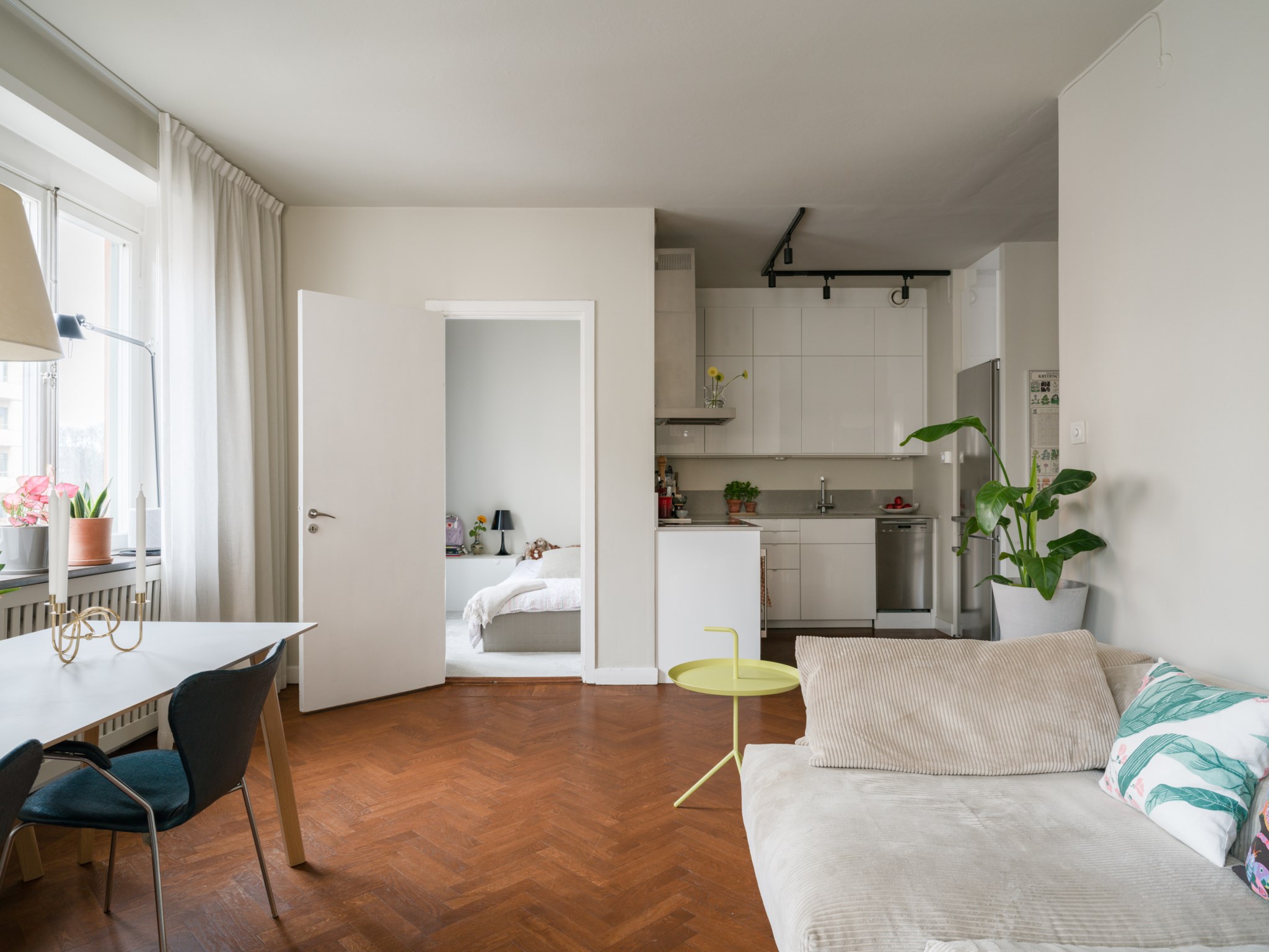Stort vardagsrum med fiskbensparkett, ljusa väggar och stora fönsterpartier i två väderstreck. Vardagsrummet är mycket lättmöblerat med plats för stor soffa, matbord och TV-möbel. Öppen planlösning mot köket gör sällskapsytorna mycket trivsamma. Utgång till balkong.