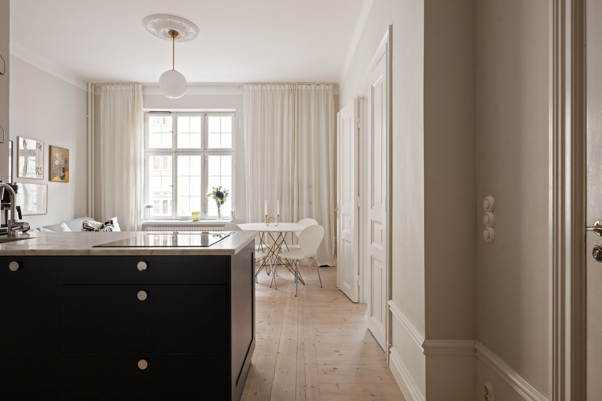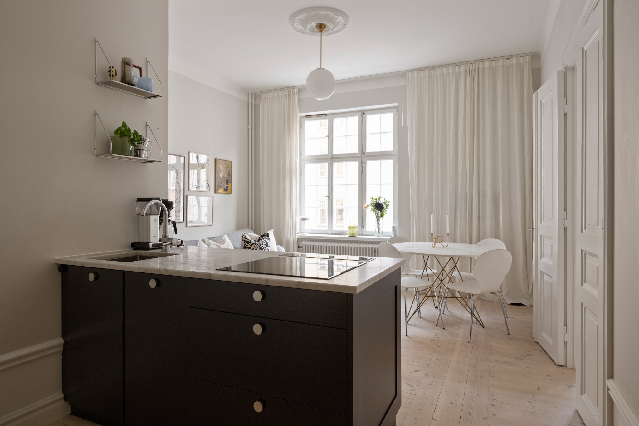 Köket är stilfullt renoverat med hög standard och full maskinell utrustning såsom induktionshäll, spisfläkt, inbyggnadsugn, integrerad kyl/frys samt diskmaskin. Här finns gott om skåpsförvaring upp till tak samt väl tilltagna arbetsytor av Carraramarmor. Köket är otroligt socialt och inbjuder till mingel och häng med vännerna runt köksön medan middagen arbetas fram.