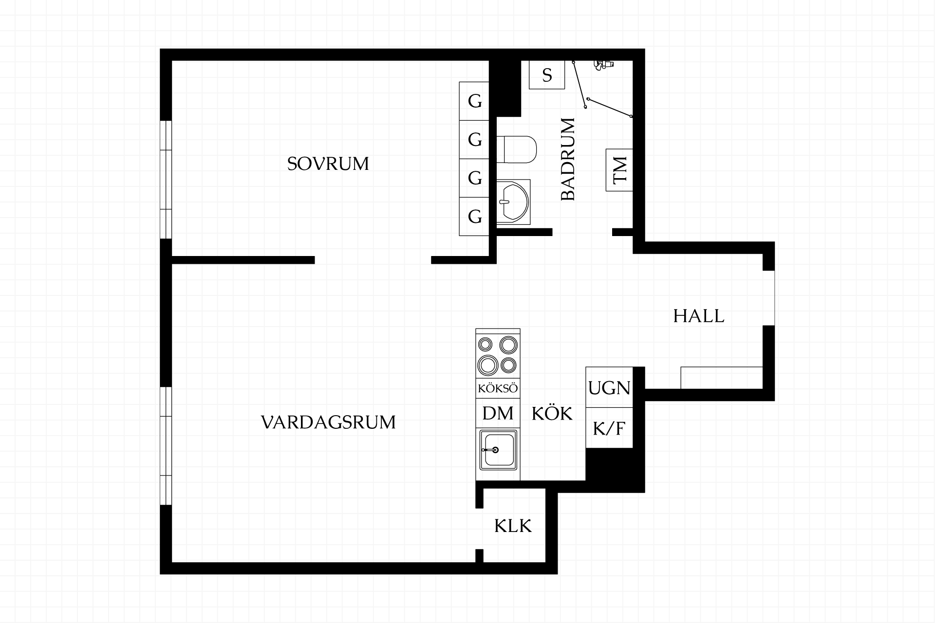 Redan från hallen slås man av lägenhetens härliga rymd tack vare den generösa takhöjden och den öppna planlösningen. Här finns goda avhängningsmöjligheter för ytterkläder och skor. Sober färgsättning och på golvet ligger det fina vitoljade furugolv vilket är genomgående för lägenheten och ger ett ljust och enhetligt intryck.