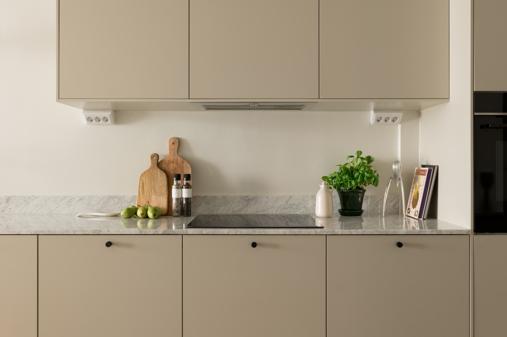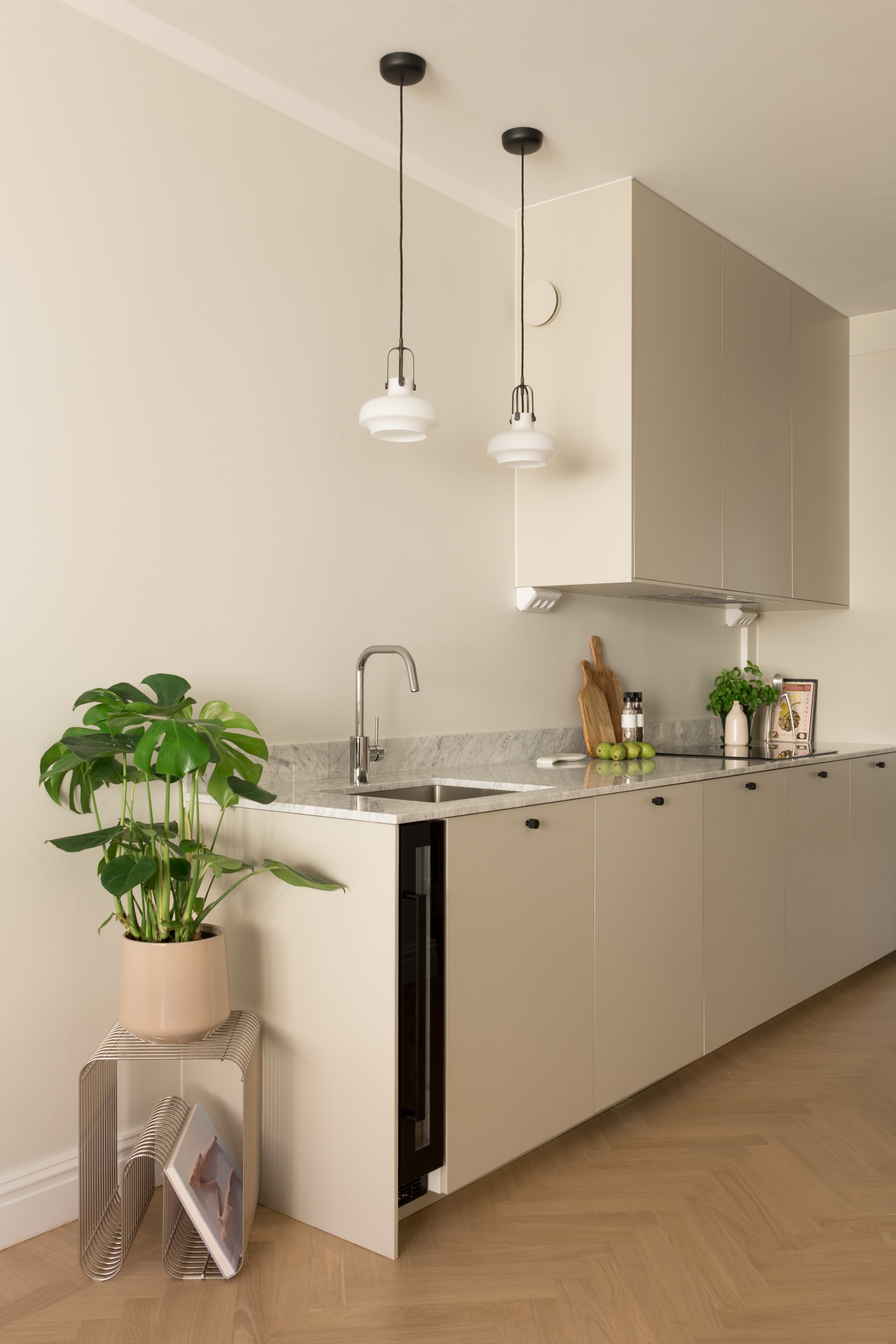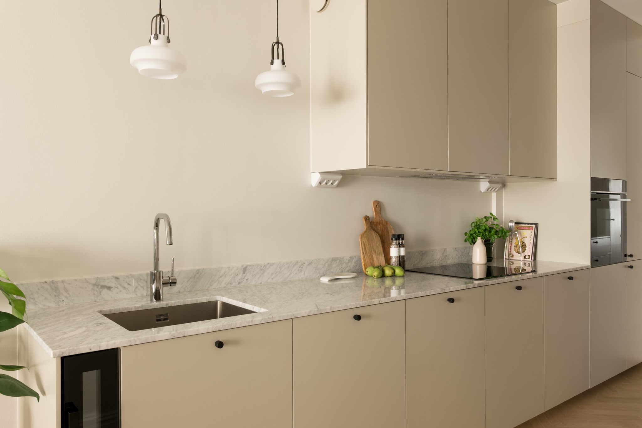 Smakfullt renoverat kök från 2025 med mycket goda arbetsytor på bänkskiva i Carrara marmor. Gott om förvaring bakom ljusbeigea luckor. Köket är fullt utrustat med spis, ugn, diskmaskin, kyl/frys samt vinkyl. Köket ligger i öppen planlösning till vardagsrummet.