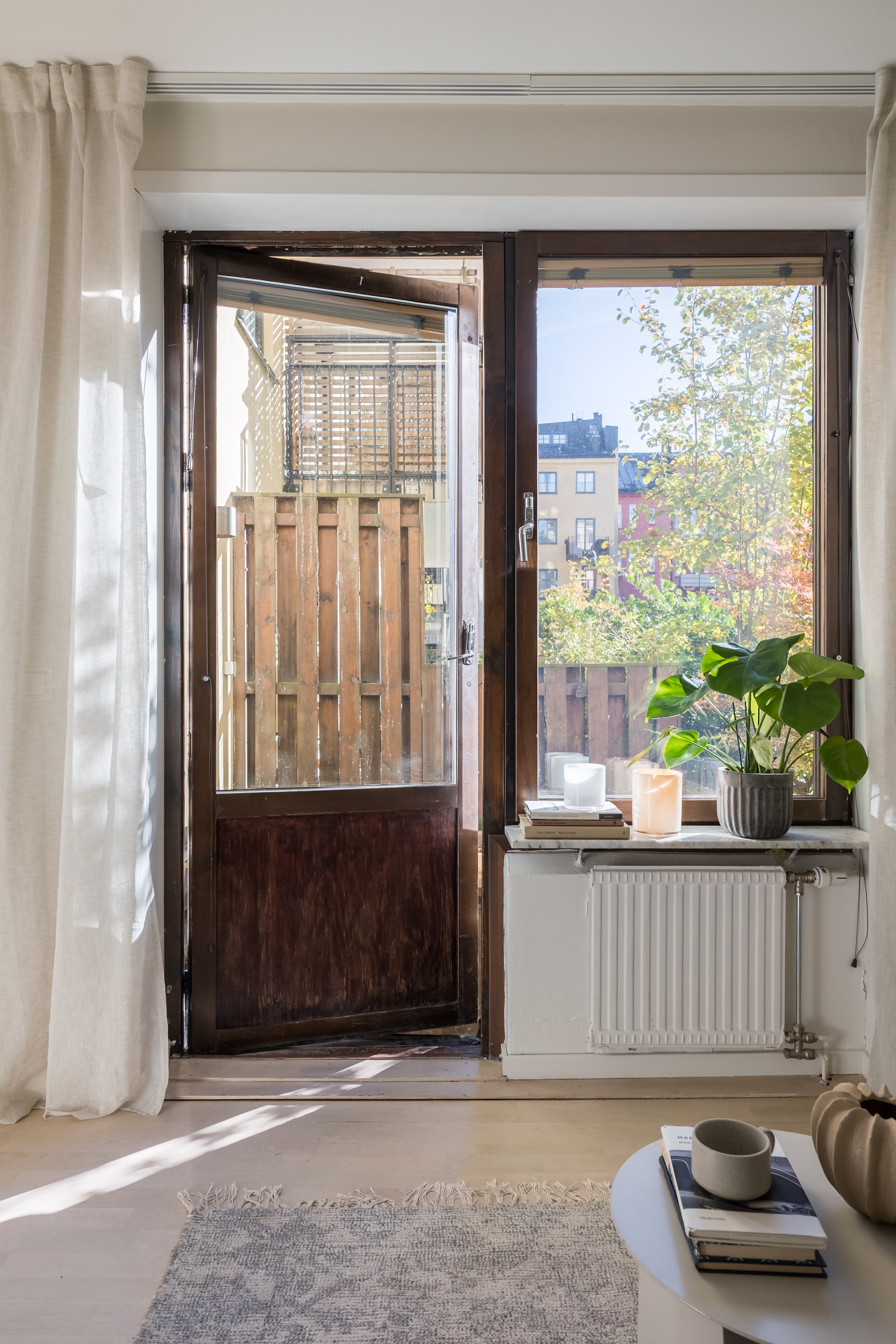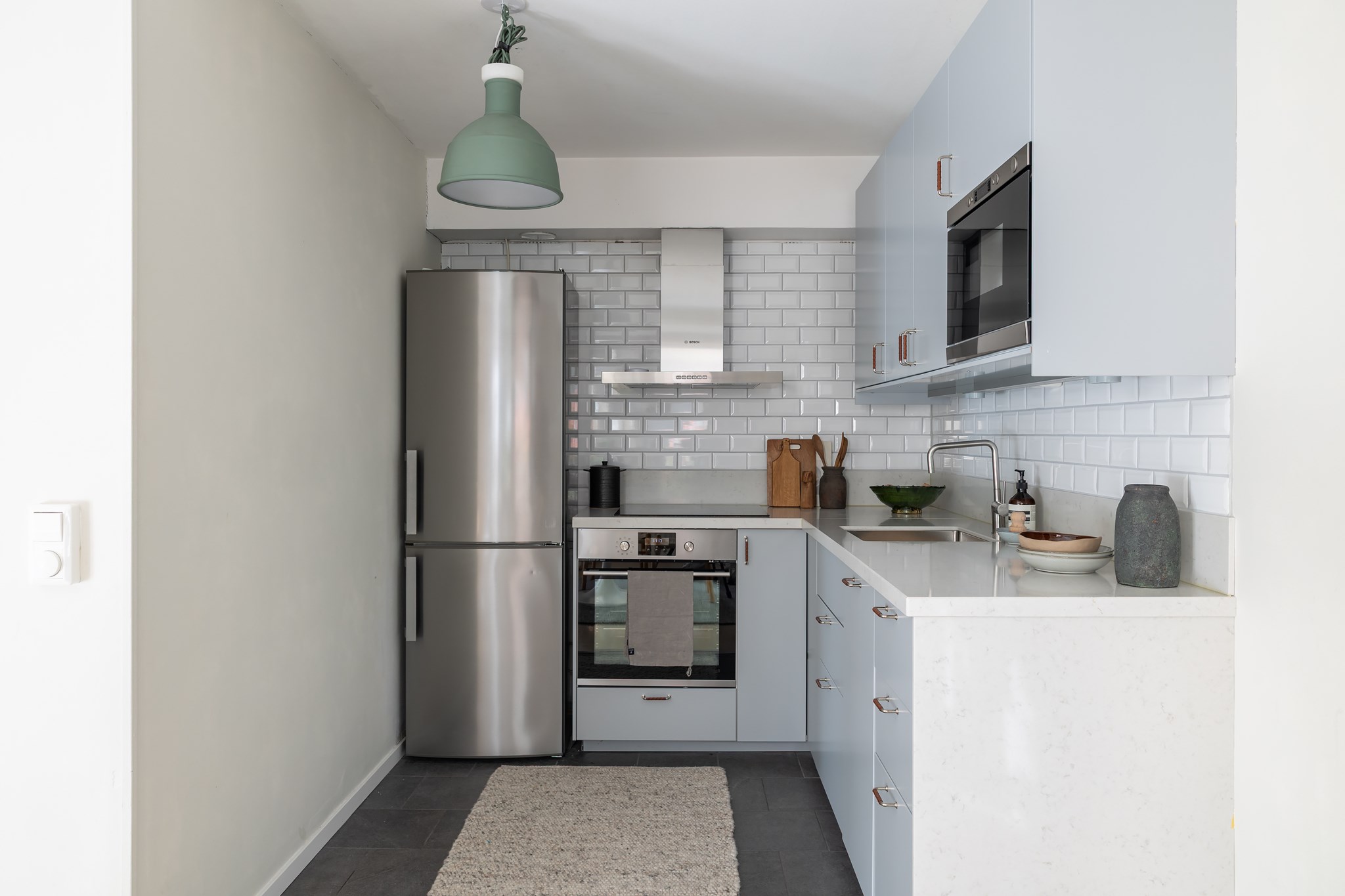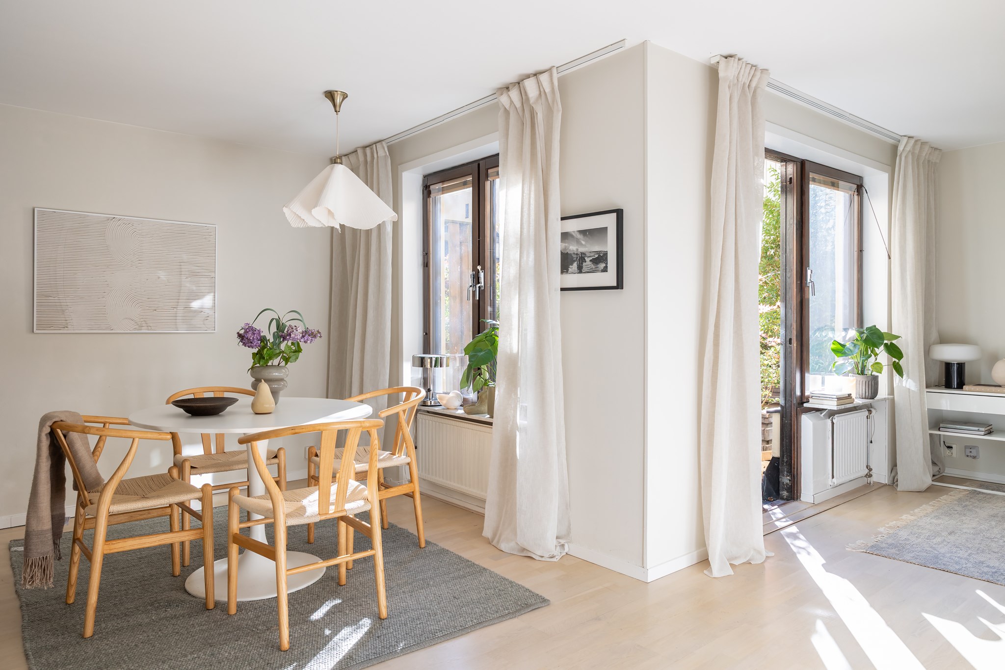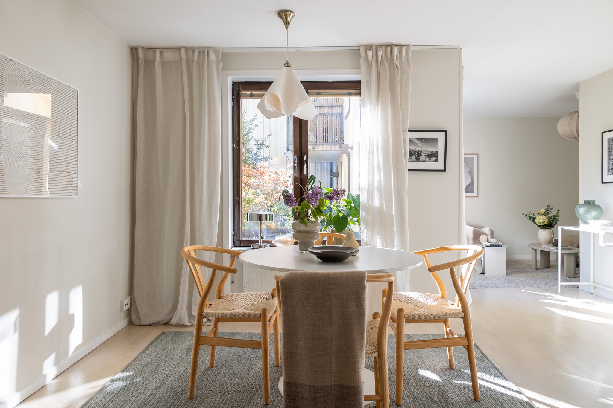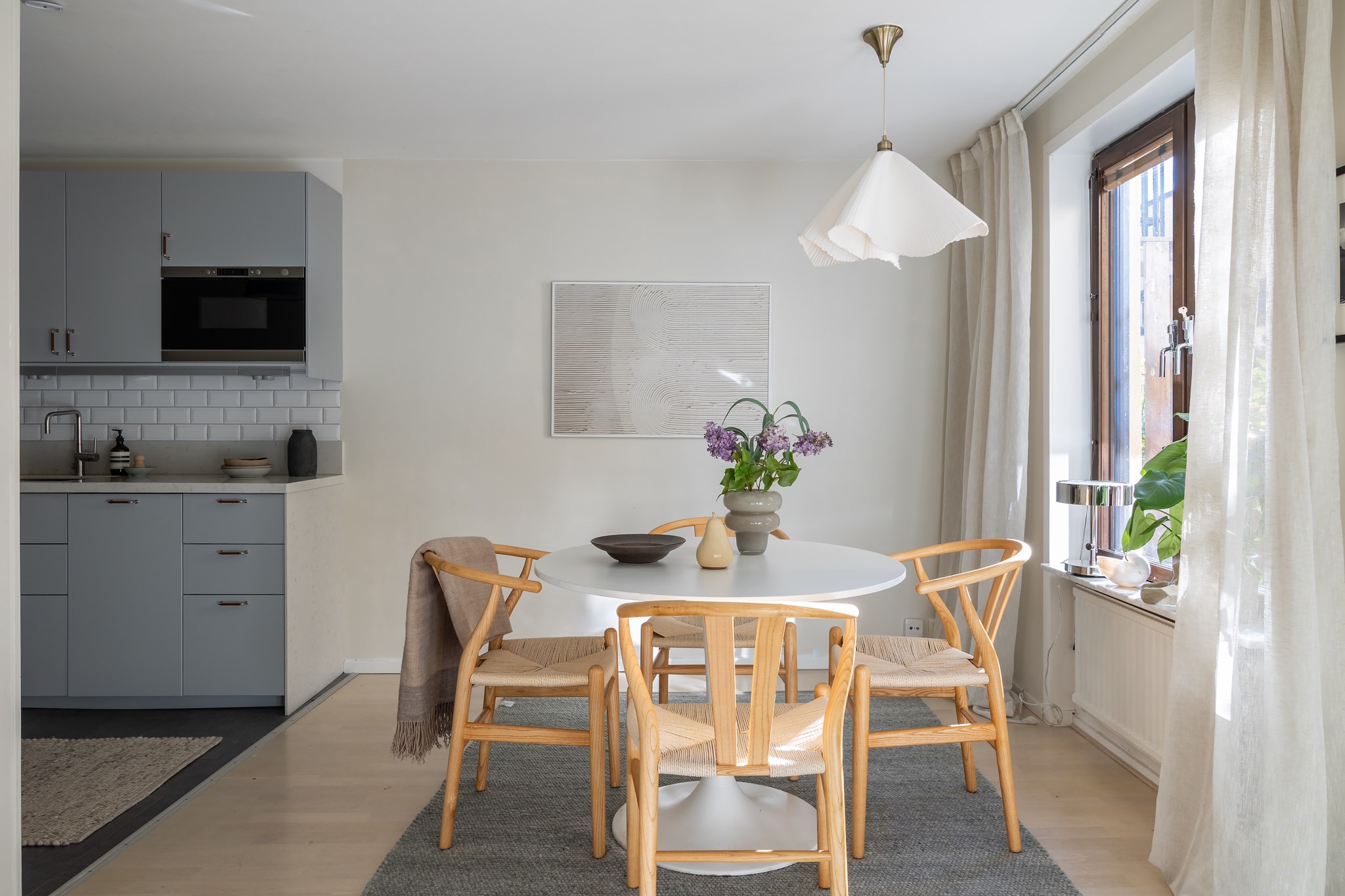 Lägenheten karaktäriseras av stilsäkra materialval, ljus färgsättning, fina golv samt bra förvarings- och funktionslösningar. Planlösningen är optimerad, ytterst kvadratsmart och väl anpassad för två personer. Öppen och social planlösning mellan kök och vardagsrum. Köket i ett klassiskt utförande med komplett maskinell utrustning och stor matplats. Köket leder vidare till vardagsrummet med plats för soffa och utgång till uteplatsen.