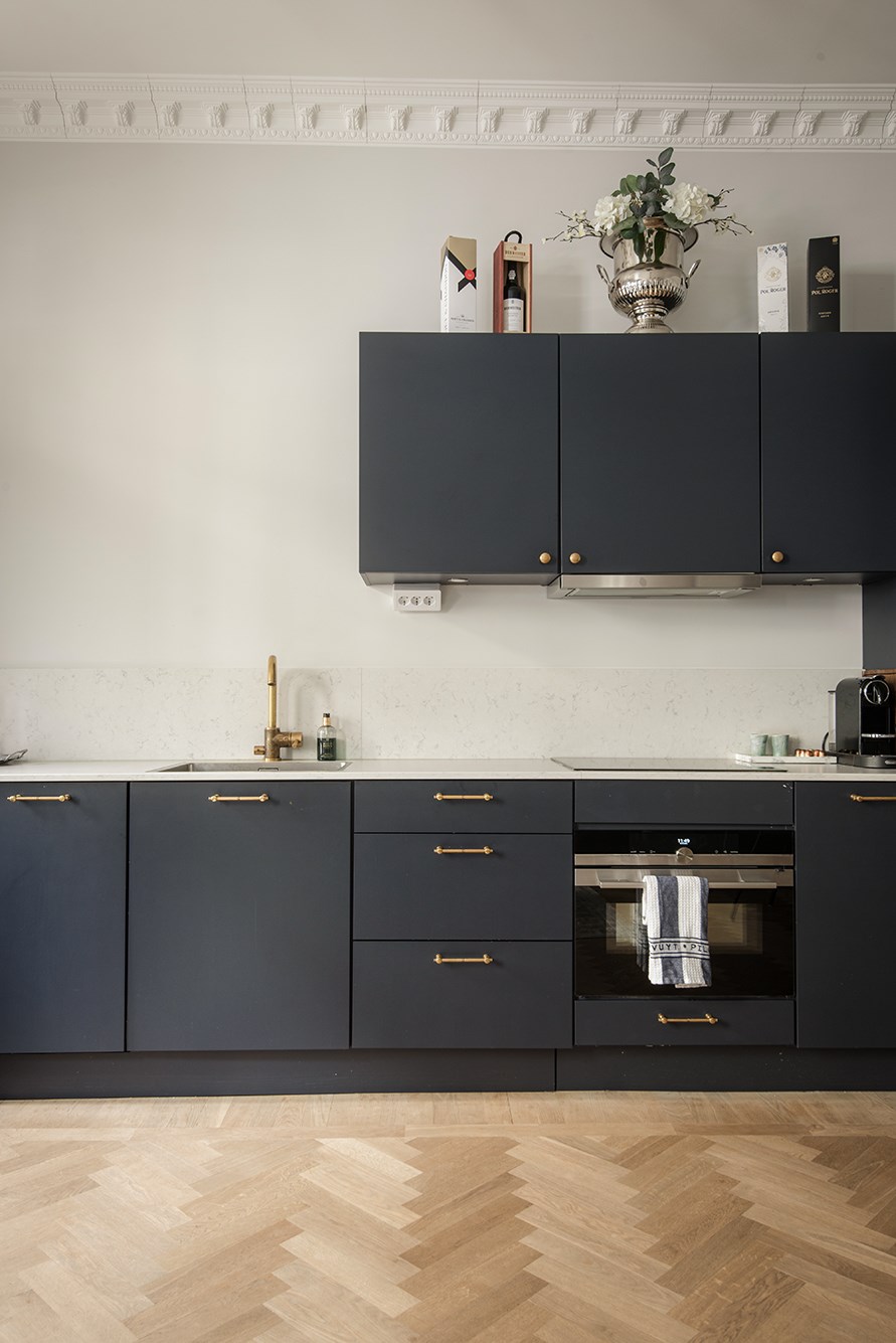 Totalrenoverat och platsbyggt kök från In-Toto med mörka luckor med mässingsbeslag som färdigställdes 2020. Arbetsbänkar och stänkskydd i ljus Silestone och blandare från Tapwell i mässing. Här erbjuds även full maskinell utrustning såsom induktionshäll, integrerad diskmaskin, integrerad kyl/frys, kombinerad ugn/mikro samt kolfilterfläkt.