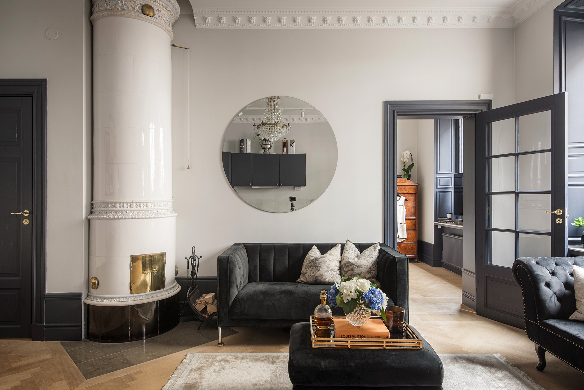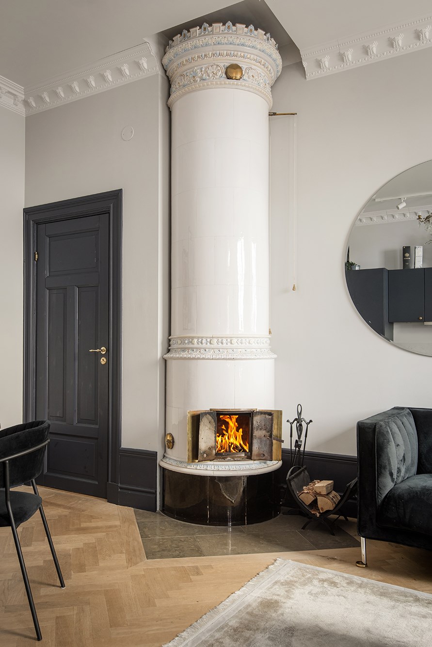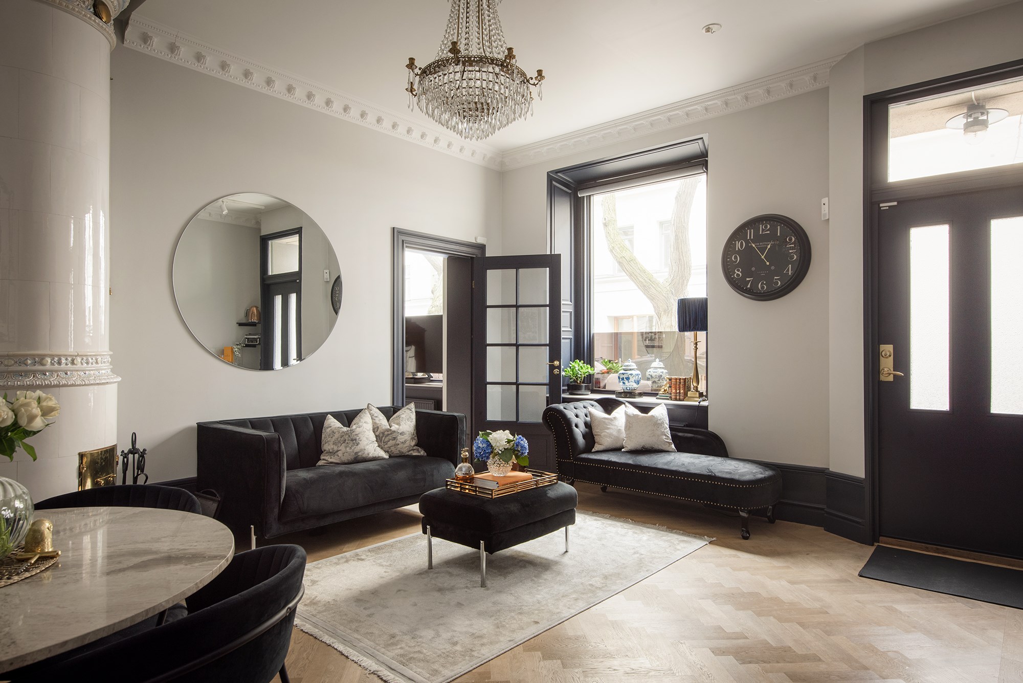 Ljust och spatiöst sällskapsrum med plats för både större soffgrupp samt en matsalsmöbel för flertalet middagsgäster. Stort, högt fönster med extra djup nisch vetter ut mot lugn återvändsgata och ger ett härligt ljusinsläpp. Här finns även en extra entré vilket ger en känsla av att bo i en villa mitt i stan. Den öppna och sociala planlösningen mot det stilfulla köket skapar en otrolig rymdkänsla och blir den perfekta ytan för mingel och större middagsbjudningar. I rummets ena hörn finns en vacker utsmyckad kakelugn som ger extra mysfaktor den kallare delen av året.