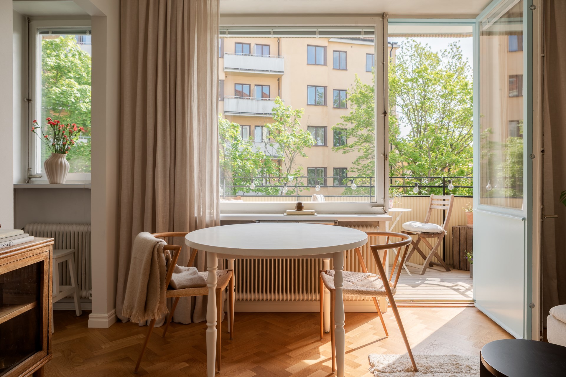 Stort och luftigt vardagsrum med en smart alkov som skapar en mysig sovplats, utan att kompromissa på utrymmet i resten av lägenheten. Här får du både en bekväm sängplats och gott om yta för att umgås och trivas. De stora fönstren bidrar till ett härligt ljusflöde och gör att lägenheten känns rymlig och inbjudande. Den soliga balkongen ger ett extra plus och låter dig njuta av många soltimmar med en vacker sjöutsikt och över omgivningarnas grönska.