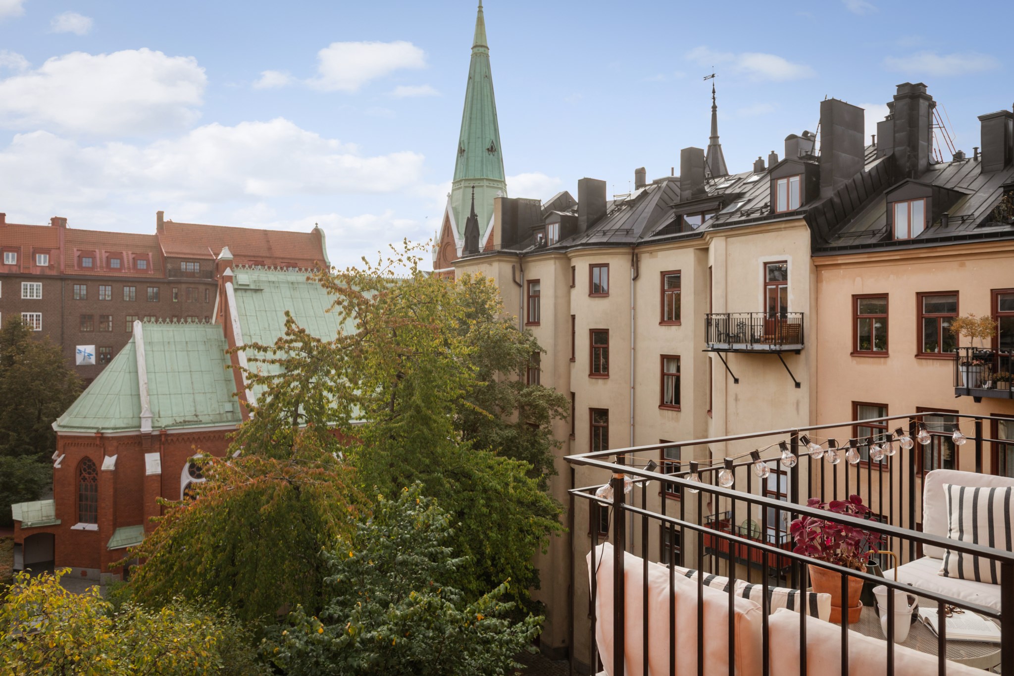 Balkong i söderläge med plats för möbler och växter – en trivsam förlängning av sovrummet med fri sikt över grönska och mot Sankt Georgios kyrka.