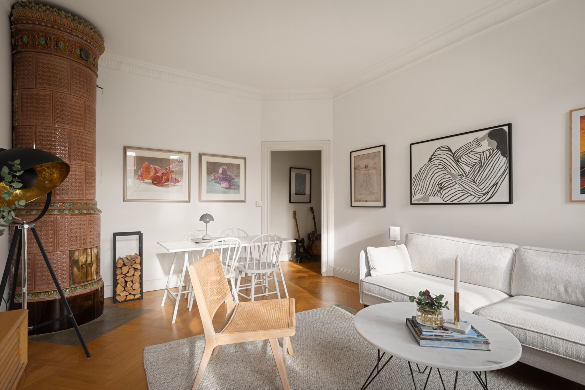 Imponerande vardagsrum med bevarad stuckatur, kakelugn och stora fönster som släpper in rikligt med ljus. Gott om plats för både soffgrupp, fåtöljer och matbord.