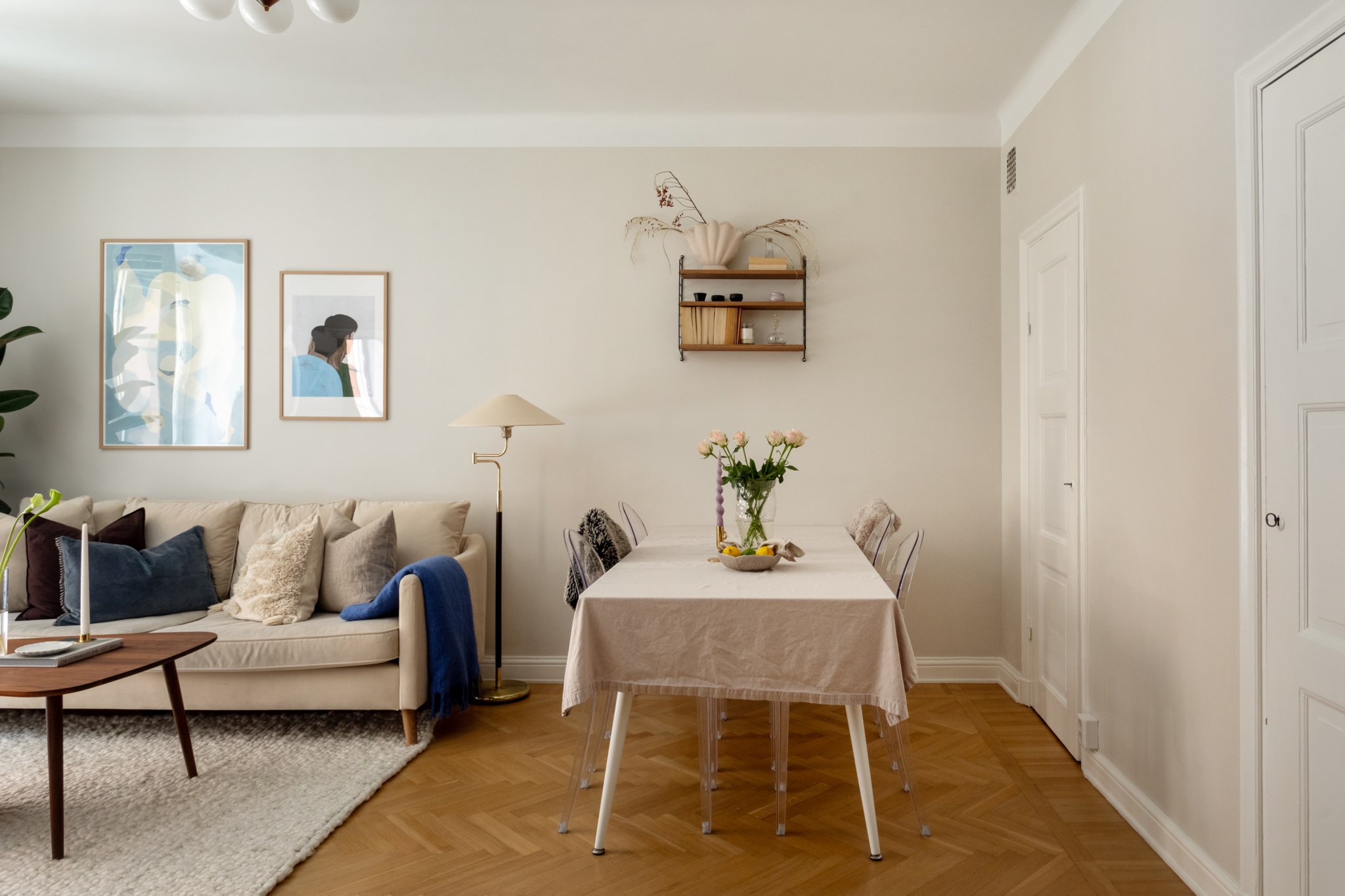 Bostaden har många fint bevarade originaldetaljer såsom speglade innerdörrar, serveringsskåp och generös takhöjd, samtidigt som ytskikt och kök är smakfullt uppdaterade i en lugn, samtida färgskala.