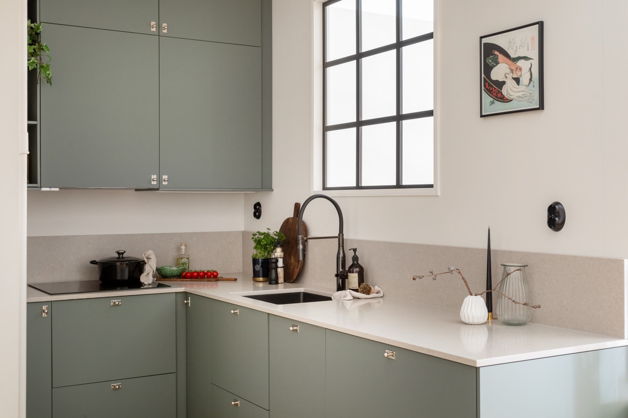 Smakfullt kök i öppen disposition mot vardagsrummet. Gröna luckor, bänkskiva i kompositsten och gott om förvaring. Köket är fullt utrustat med kyl/frys, induktionshäll, integrerad diskmaskin, inbyggnadsugn och mikro i arbetshöjd samt kolfilterfläkt. Smidesfönster ger ett fint ljusinsläpp till kök och hall.