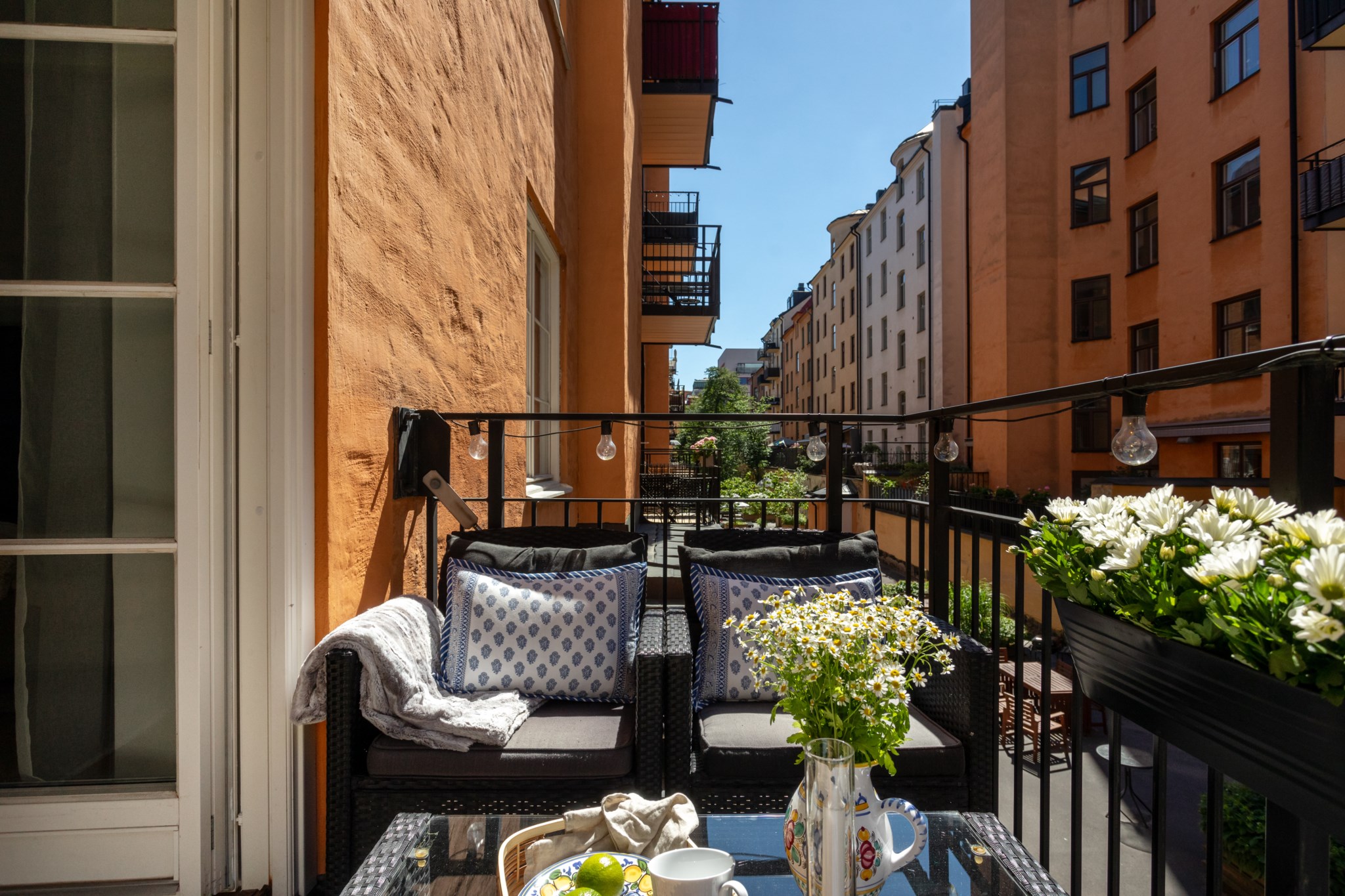 Stor och solig balkong i sydvästligt läge mot gården. Här finns gott om plats för utemöbler och planteringar. Perfekt plats för balkonghäng med vännerna eller en stund för dig själv.