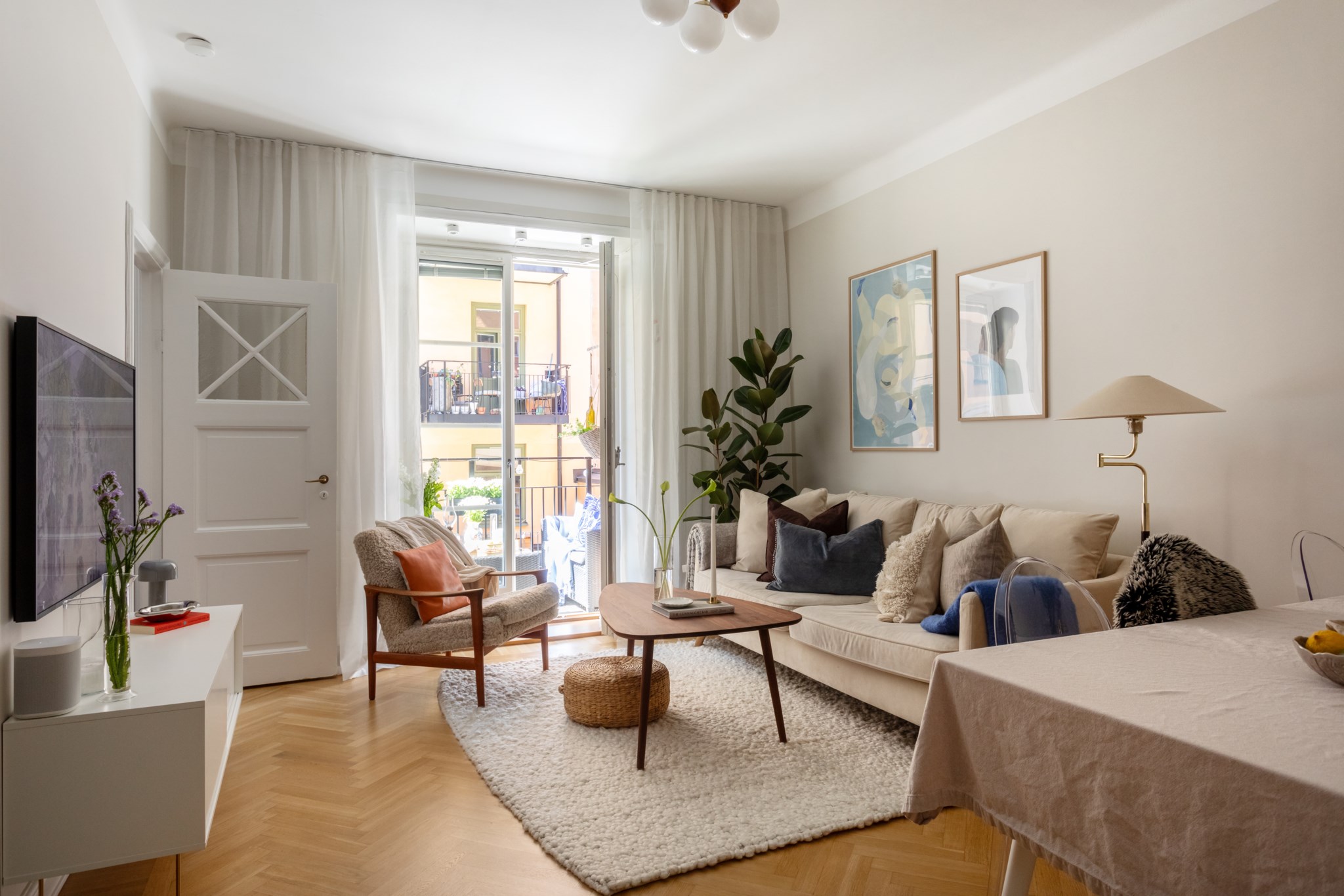 Det stora vardagsrummet ligger i öppen planlösning mot köket och erbjuder en utgång till den härliga balkongen. Även här ligger den vackra fiskbensparketten och väggarna är ljusmålade. Rummet är mycket lättmöblerat och rymmer såväl soffa som tv-bänk och ett ordentligt matbord för 6-8 personer. I anslutning till vardagsrummet finns en generös klädkammare med hyllor och stänger för förvaring.
