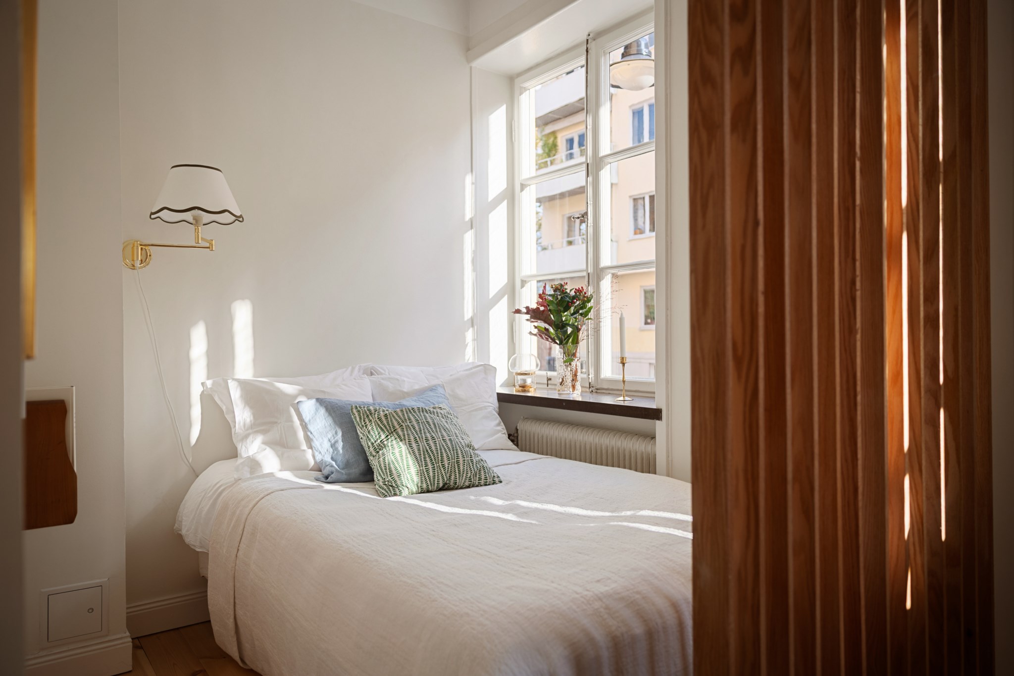 Mysig sovdel med spröjsat fönster och plats för 140 cm säng. (Idag står en 105 cm säng). Trägolv och ljusa väggar. Snygg träspaljé mot vardagsrummet.