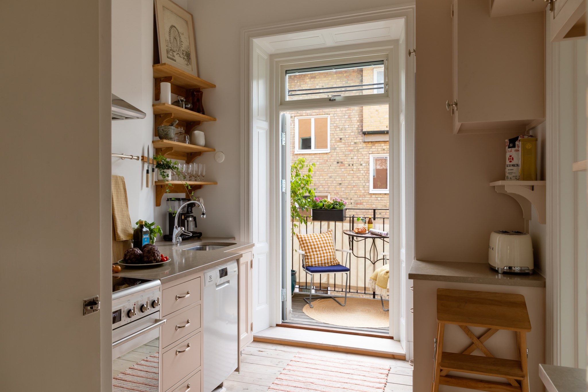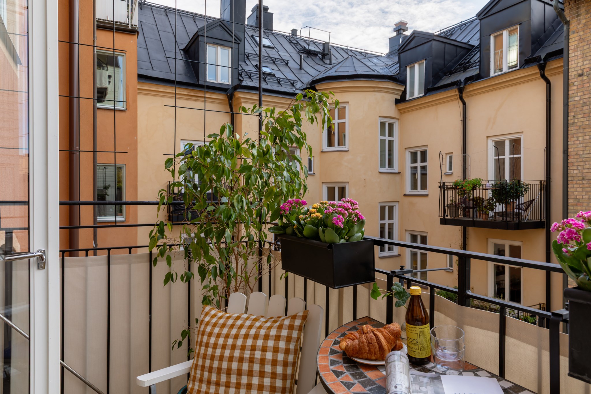 Ljust och stilrent kök som renoverades 2021 och harmoniserar perfekt med byggåret. Generösa förvaringsmöjligheter och bra arbetsyta på den vackra bänken. Köket är utrustat med kyl & frys, diskmaskin, spishäll, ugn, fläkt, och diskho. Öppen förvaring på trähyllor adderar charm. Vackert och gediget trägolv. Härifrån nås den ljuvliga balkongen mot den tysta gården och i bästa solläge via glasade pardörrar. Balkongen är generös nog att bjuda vänner till och här finns gott om plats för möbler och planteringar. Tack vare att fastigheten ligger i souterräng är man i ett högt läge med himmelskontakt och i kombination med söderläget gör det att man sommartid njuter av många soltimmar.