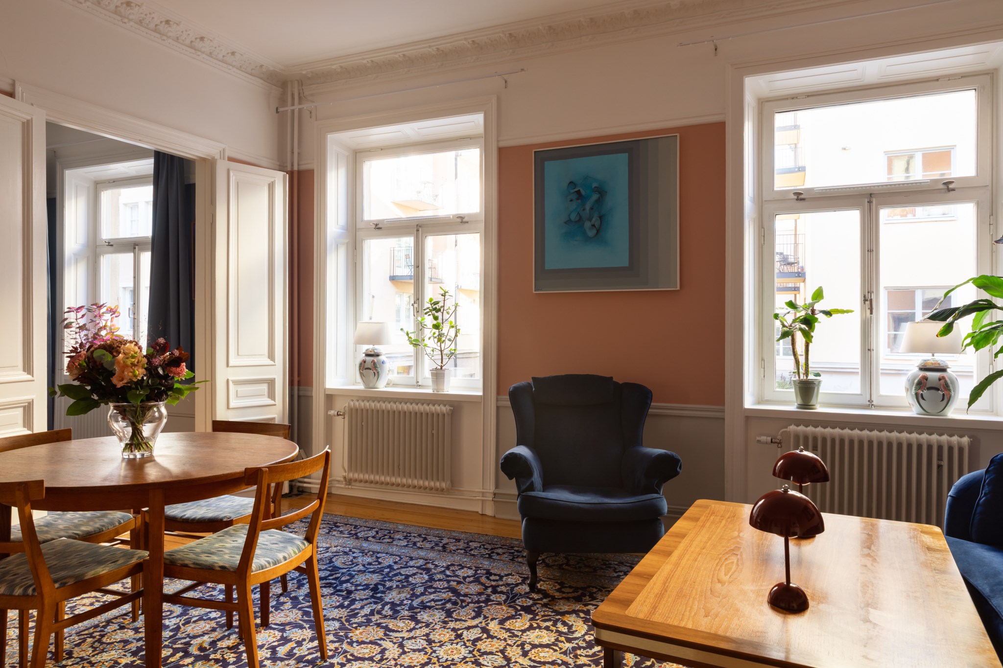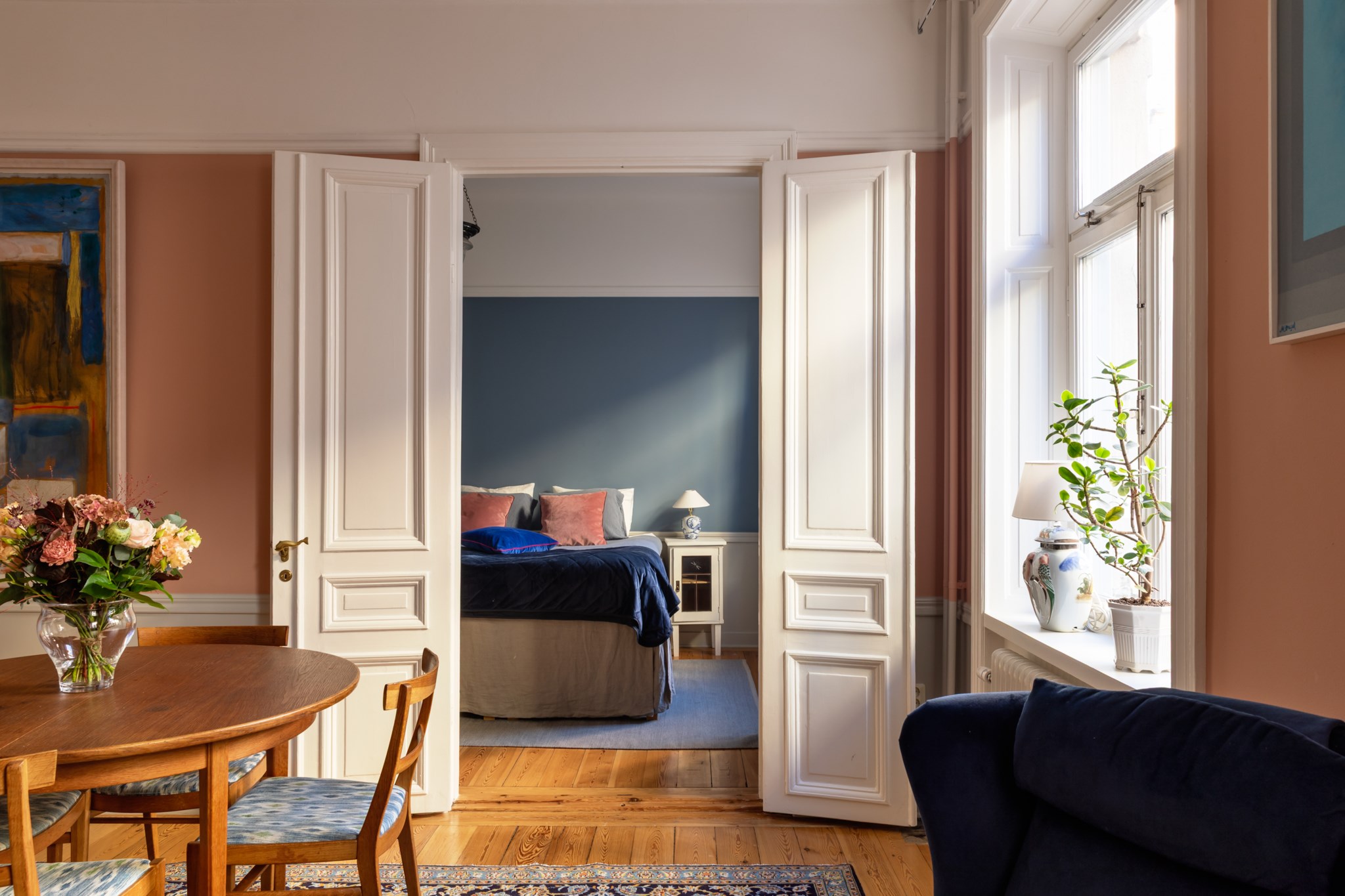 Från hallen nås det ljuvliga sällskapsrummet. En fullt fungerande och vacker kalkugn tronar upp sig i bakgrunden, på golvet ligger en mjukt plankgolv med synliga furutiljor i original, en takrosett, stuckaturer och bröstpaneler samspelar fint med väggfärgen. Rummet är rymligt med stora möjligheter till social samvaro. Här finns plats för både soffgrupp och stor matplats. Två stora fönsterpartier med djupa speglade nischer släpper in rikligt med ljus in i rummets alla vrår. Fin vy mot den gröna gården tvärs över gatan, vilket gör det långt till nästa fastighet och begränsar därmed insynen. Invid kakelugnen nås en inbyggd garderob.