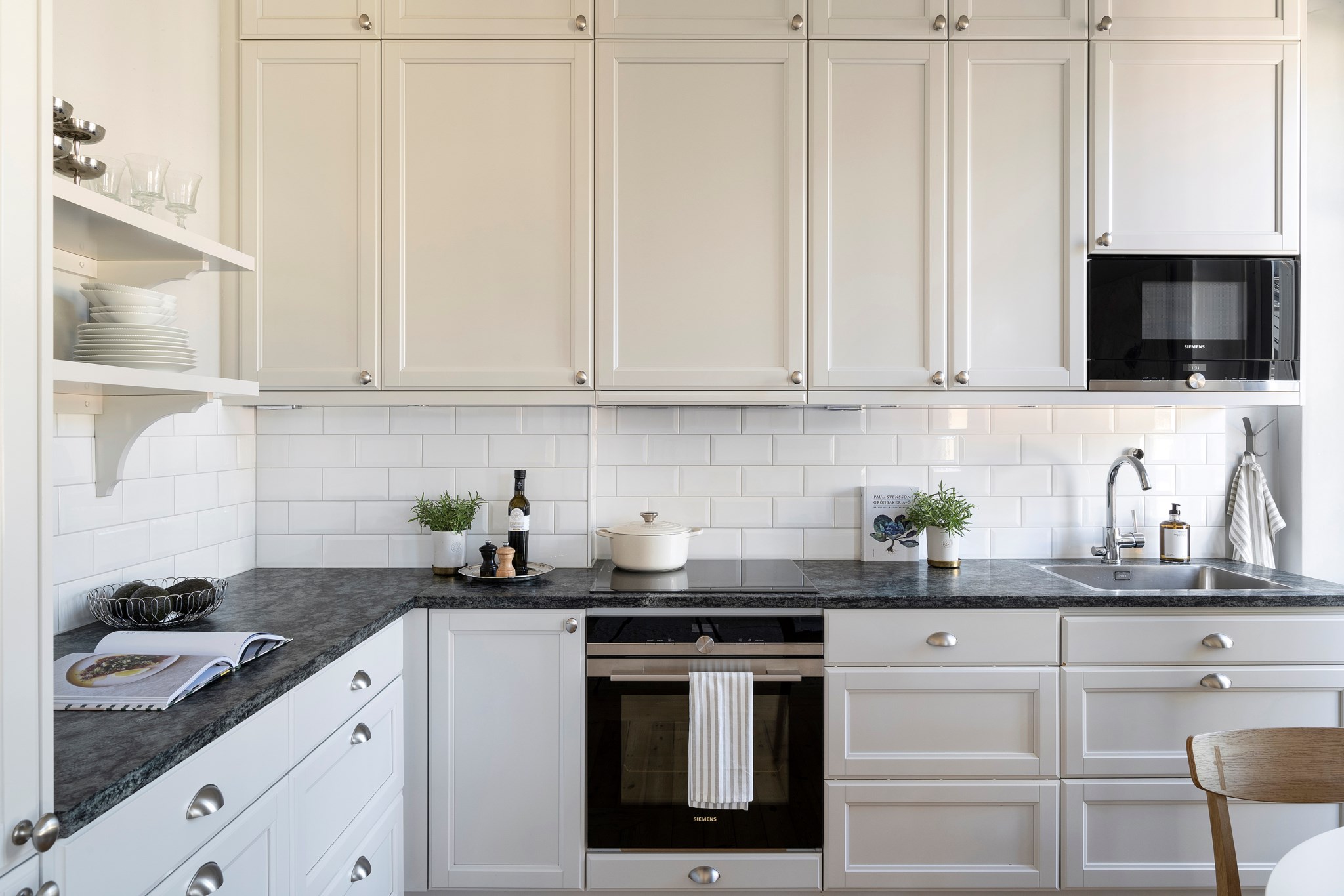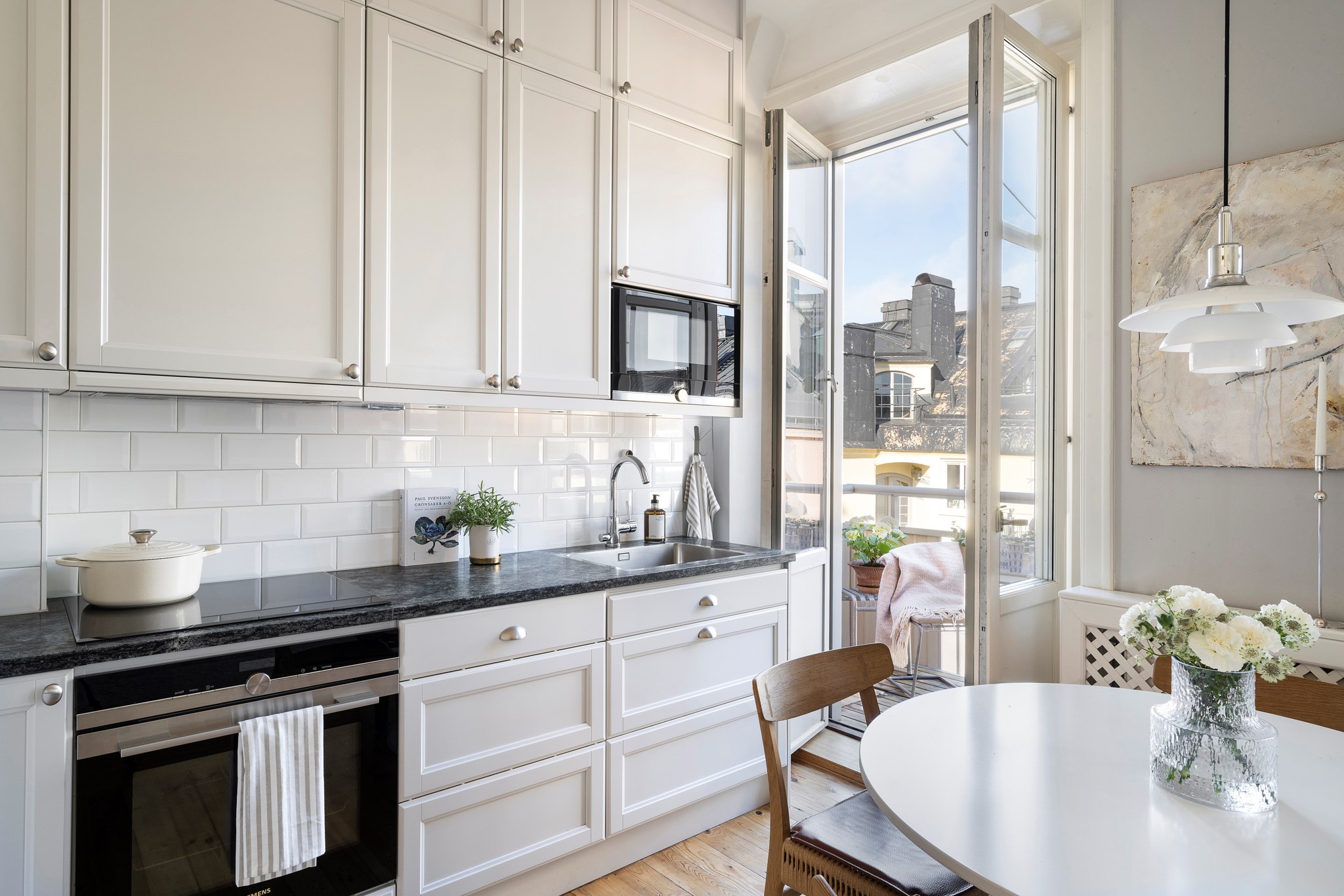 Modernt och fullutrustat kök i klassisk stil med gott om skåp och arbetsytor. Fullutrustad maskinpark med diskmaskin, ugn, häll, fläkt, kyl/frys och inbyggd mikro. Utgång till balkong med utsikt över taken.