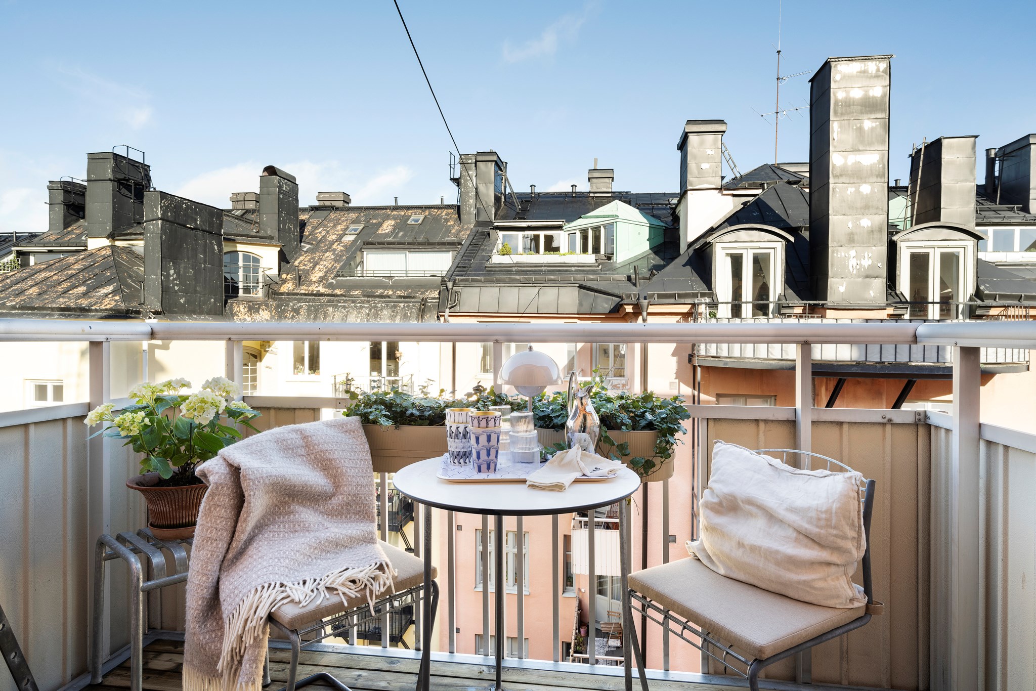 Möblerbar balkong i norrläge med utsikt över Vasastans takåsar. Morgon- och kvällssol under årets sommarmånader samt en härligt lugn atmosfär högt upp i huset.