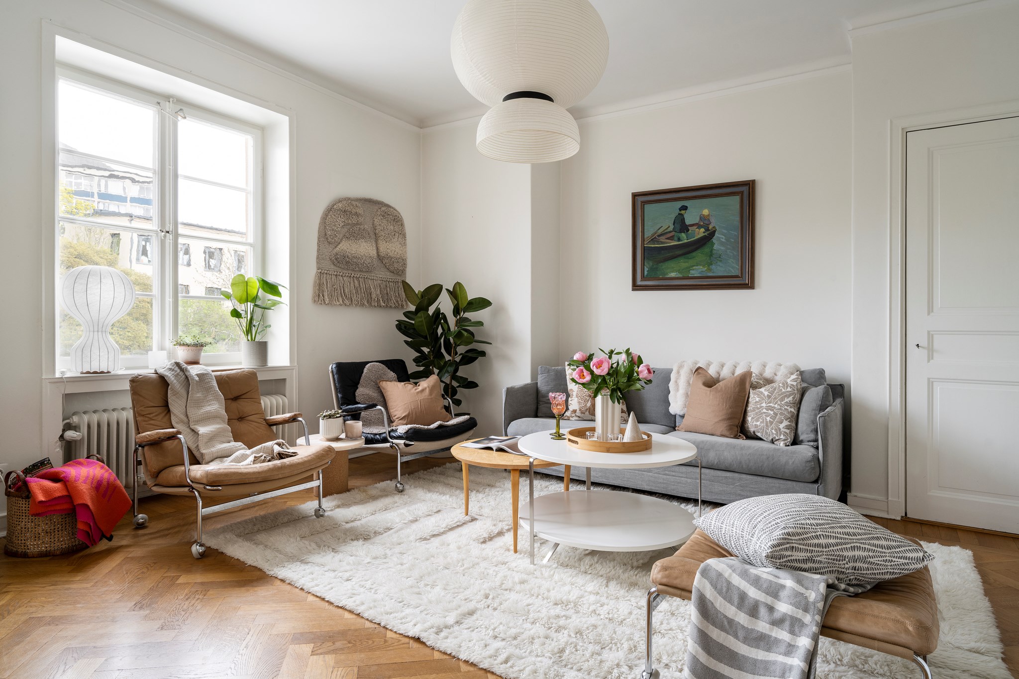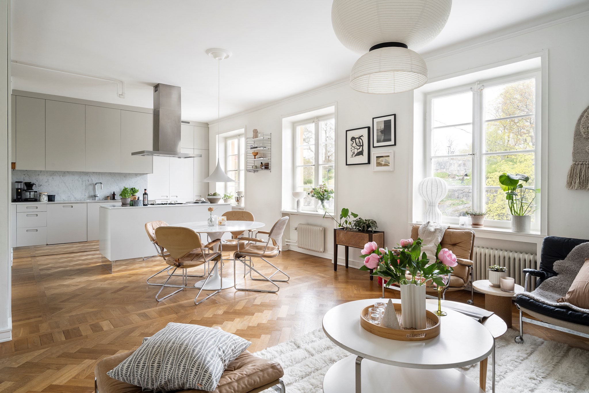 Ljust och luftigt vardagsrum i klassiskt 1920-talssnitt, med tre fönster i fil och utsikt mot Vasaparken. Här får både soffgrupp och matsalsbord plats, och rummet ramas in av vacker fiskbensparkett. Perfekt för umgänge med vänner och avkoppling med familjen.