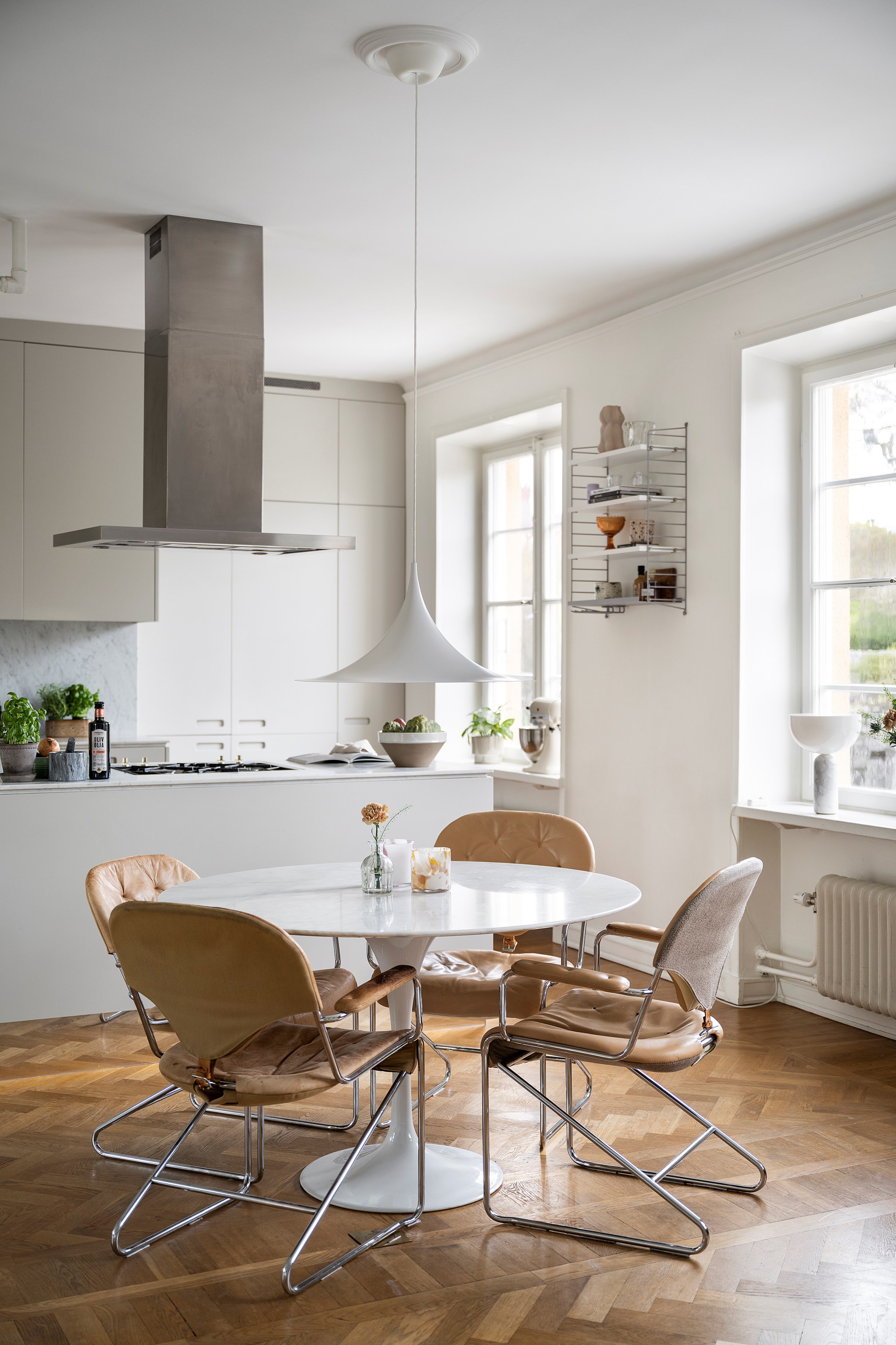Originaldetaljer som fiskbensparkett, speglade innerdörrar, spröjsade fönster och bevarade skjutdörrar ger bostaden karaktär och själ, medan den generösa takhöjden förstärker känslan av rymd och ljus.