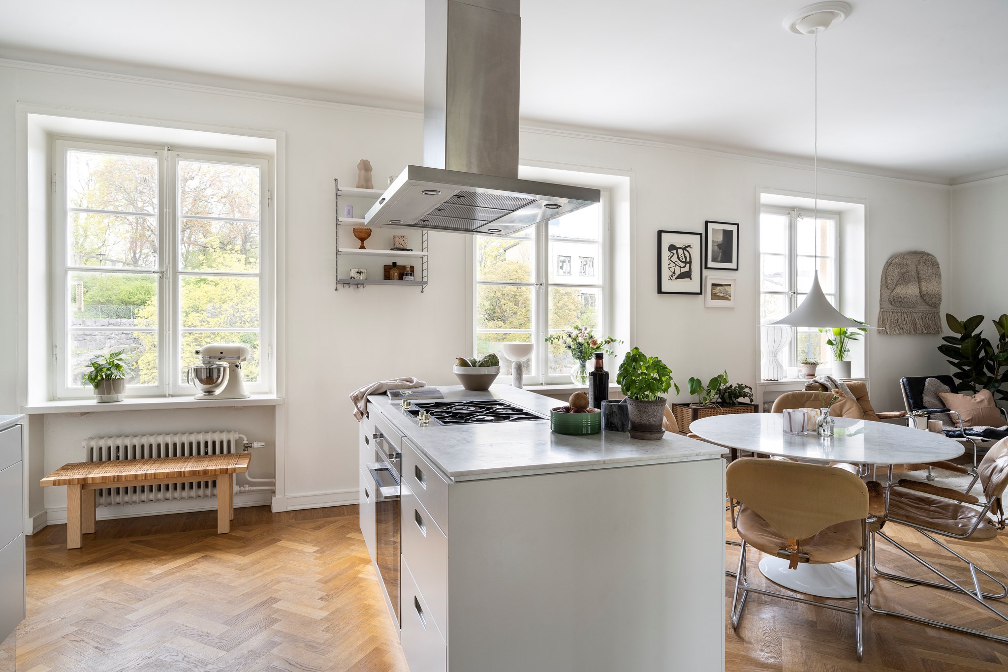 Ett stort och inbjudande kök med fönster mot Torsgatan och social öppenhet mot vardagsrummet. Här ryms både familjens frukostar och långa middagar med vänner. Gott om förvaring, bra arbetsytor och vackra ljusinsläpp gör detta till ett rum att trivas i. Moderna vitvaror i form av integrerad kyl/frys, inbyggd tvättmaskin, diskmaskin, gashäll med elugn och fläkt finns. Vid den härliga köksön kan man förbereda maten och samtidigt hålla gästerna sällskap eller titta på TV.