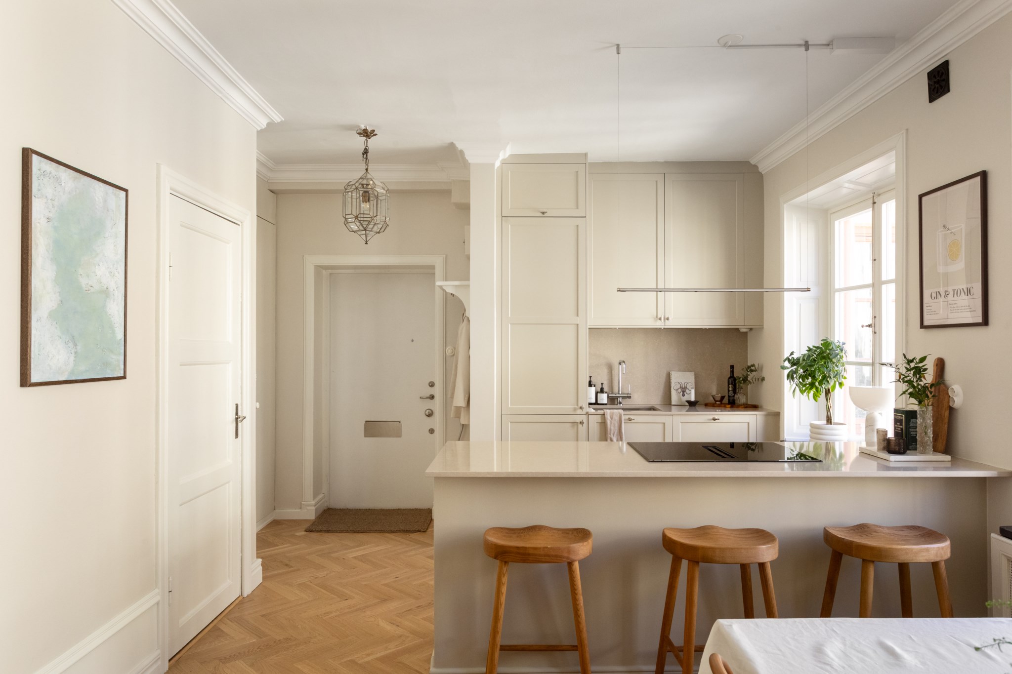 Lägenheten är smakfullt och modernt renoverad i ett stilsäkert utförande med sobra kulörer och generös förvaring för två personer. Samtidigt bevaras vackra detaljer i sekelskiftesstil såsom högt till tak, fiskbensparkett, fina snickerier, spegeldörrar och hela tre spröjsade och högresta fönsterpartier i fil som ger ett magiskt ljusinsläpp och en känsla av rymd.