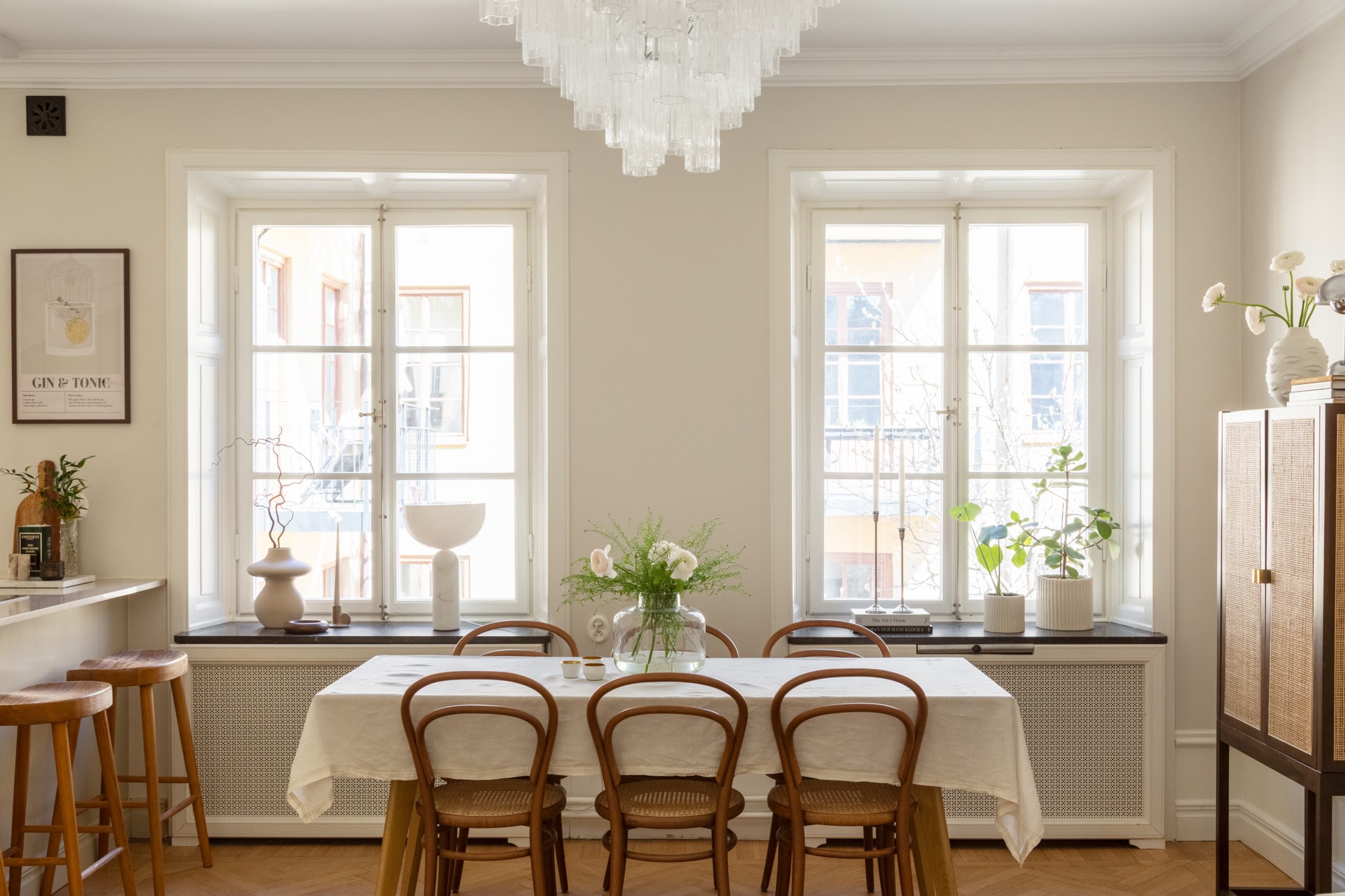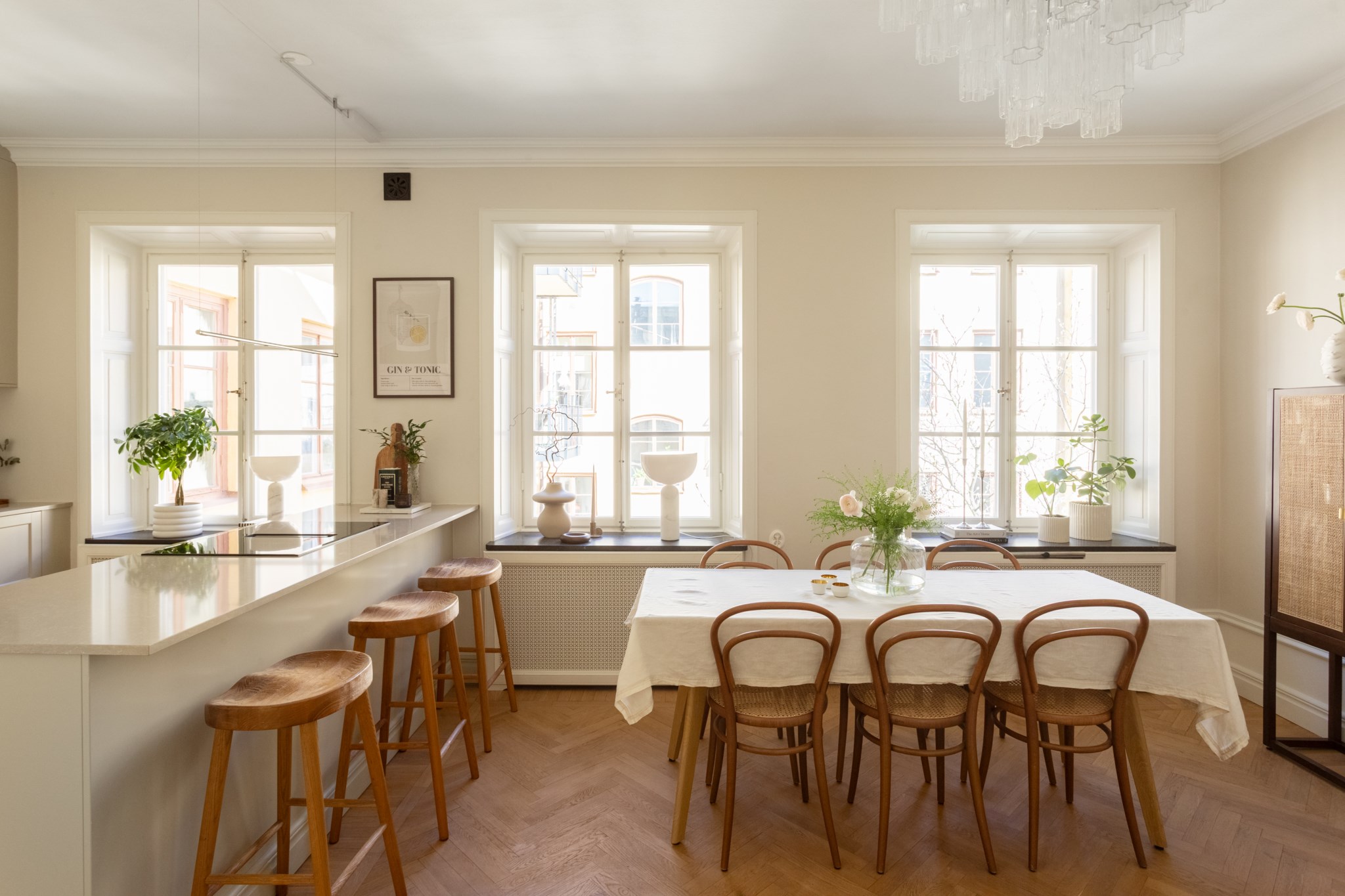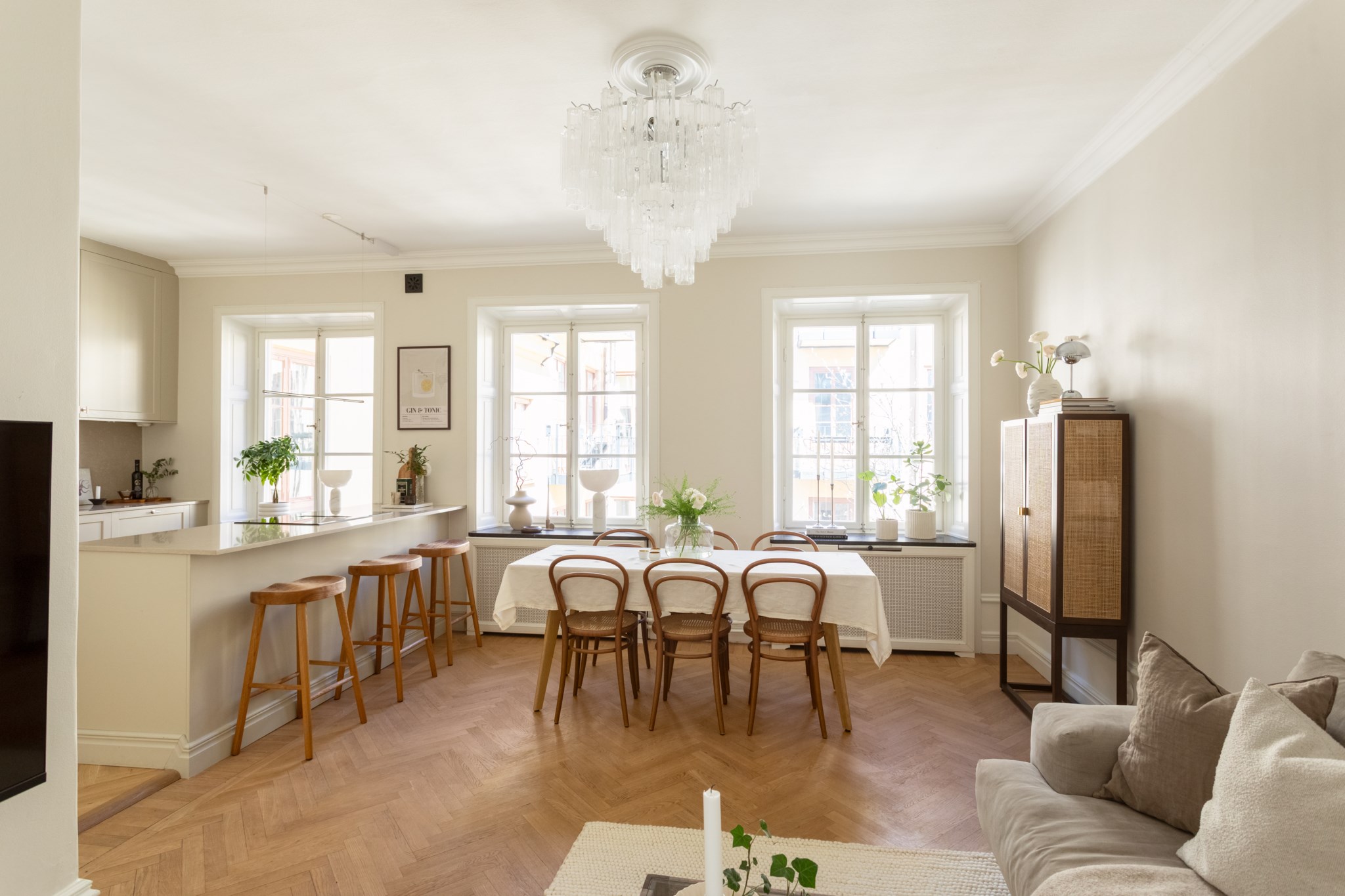 Planlösningen är optimalt disponerad och mycket tillgänglig med öppna och sociala sällskapsytor i kök och vardagsrum. Det platsbyggda köket från Ballingslöv (renoverat 2024) i ett klassiskt utförande har luckor i greige, gott om förvaring, bra arbetsytor, köksö samt komplett maskinell utrustning med bland annat vinkyl. Det angränsande vardagsrummet är luftigt och har naturlig plats för soffgrupp och matsalsbord.