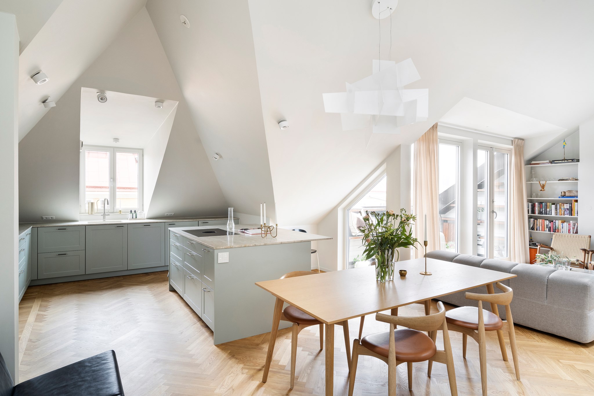 Ett påkostat och estetiskt kök utformat för både vardag och fest. Stor köksö med exklusiv bänkskiva i sten, infälld belysning och integrerade vitvaror. Ljudsystem och fönster i två väderstreck skapar stämning från morgonkaffet till sena middagar. Blicken når mot himlen och takåsarna när du står vid diskbänken -en sällsynt fin vy för ett innerstadskök.