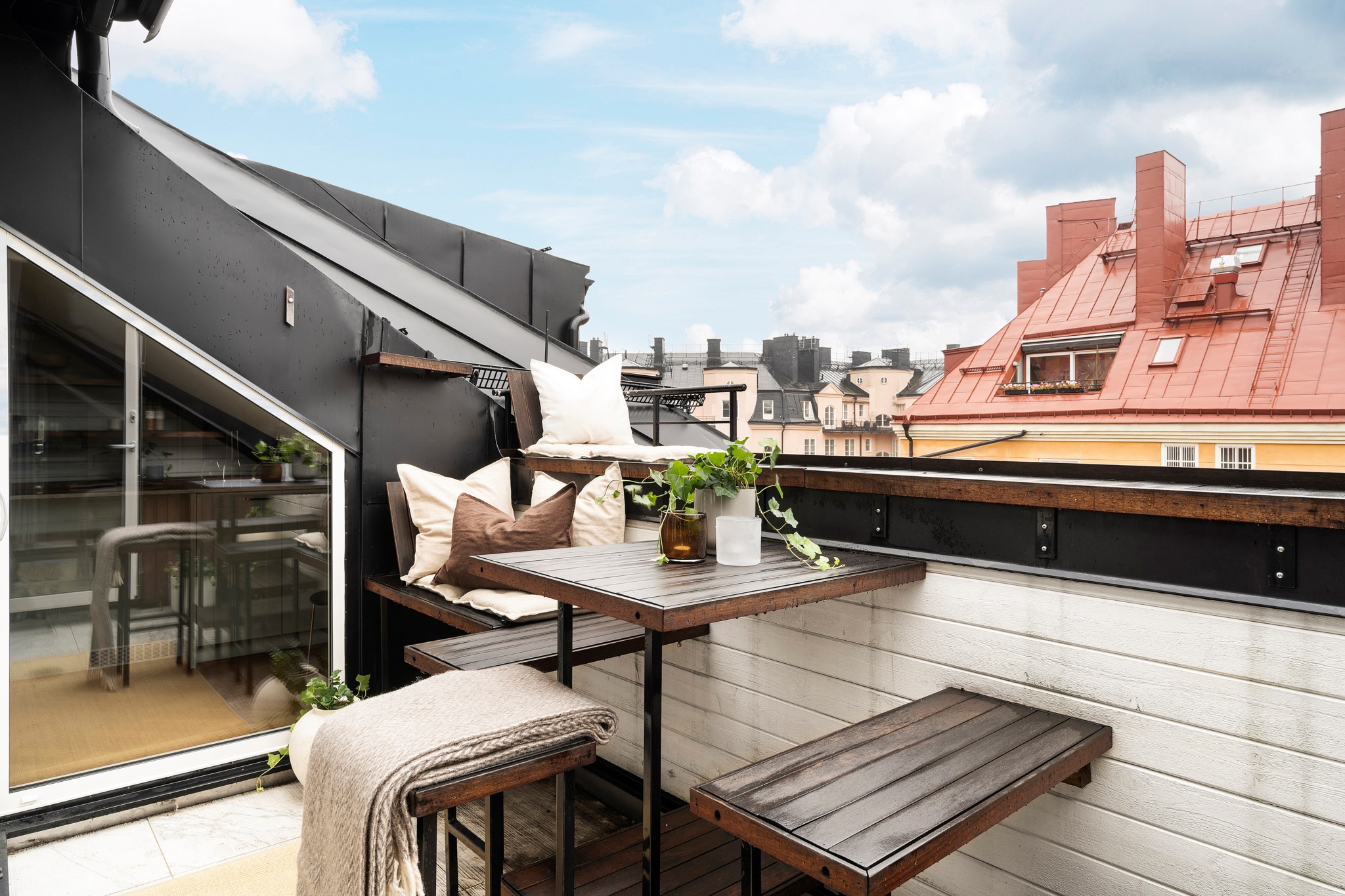En privat och solig terrass om ca 8 kvm i västerläge — en förlängning av vardagsrummet. Här njuter man av sol hela dagen, grönskande växter och härliga måltider utomhus. Platsbyggda sittmöbler, eluttag och markis gör detta till en plats att verkligen leva på, inte bara vistas.