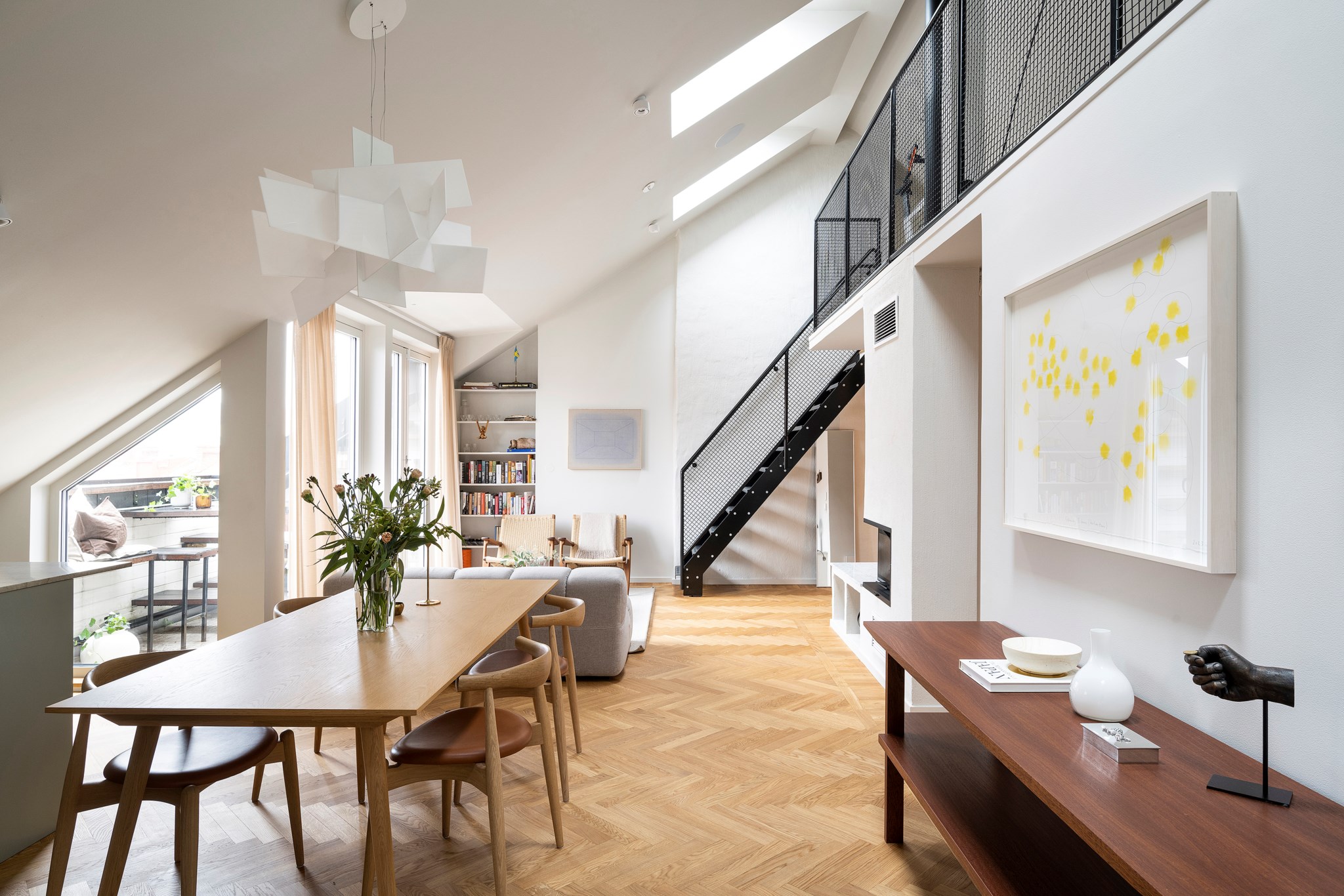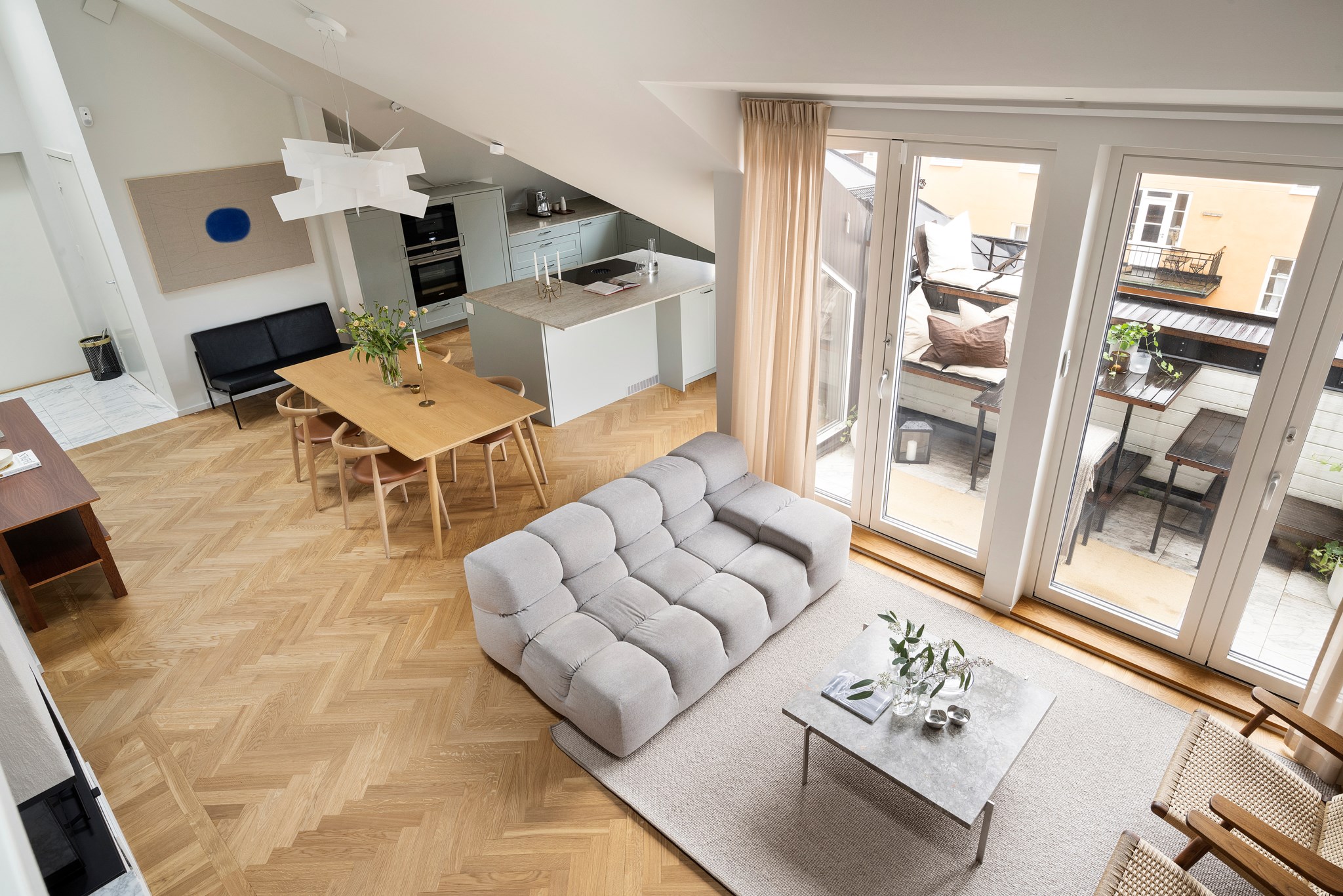 Denna väldesignade vindsvåning om totalt 125 kvm golvyta bjuder på en genomgående känsla av exklusivitet och omsorg i varje detalj. Under den vackra fiskbensparketten löper vattenburen golvvärme som ger behaglig komfort, medan de sobert målade väggarna och de exklusiva materialen skapar ett harmoniskt och stilfullt uttryck. Totalt 12 fönsterpartier i flera väderstreck, inklusive de helglasade dörrarna mot terrassen, ger ett magiskt ljusspel över från morgon till kväll. Belysningen är noga planerad och kan styras från smakfullt utformade paneler, liksom det diskreta ljudsystemet som höjer känslan av kvalitet i vardagen.