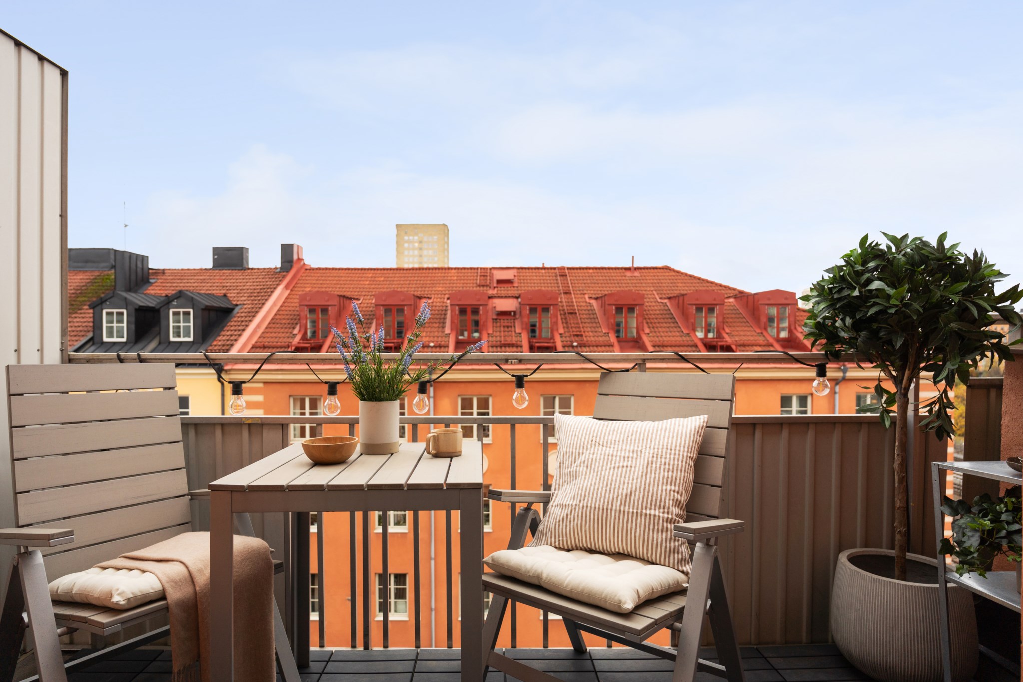 De två terrasserna om ca 8 kvm respektive ca 4 kvm är förtrollande ljuvliga och ger soliga "uterum" med utsikt mot himmel och kringliggande takåsar - perfekta för morgonkaffe i österljus, eftermiddagssol i solsäng och middagar i kvällssol.