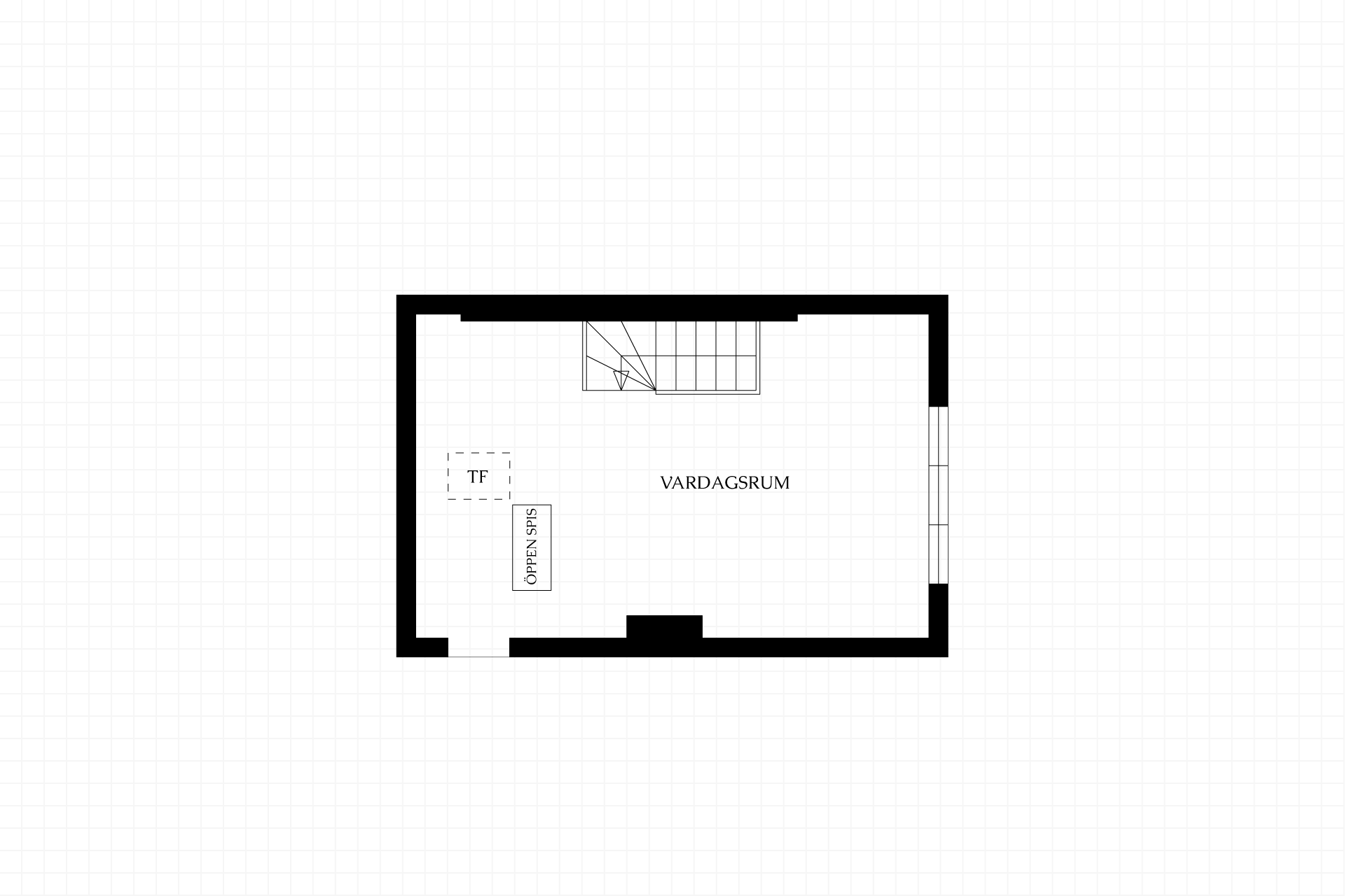 Vardagsrummet på det övre vindsplanet ramas in av snedtak och synliga takbjälkar, både fönsterkupa och takfönster samt en stämningsfull öppen spis. Här ges plats för soffgrupp och i övrigt valfri möblering.
