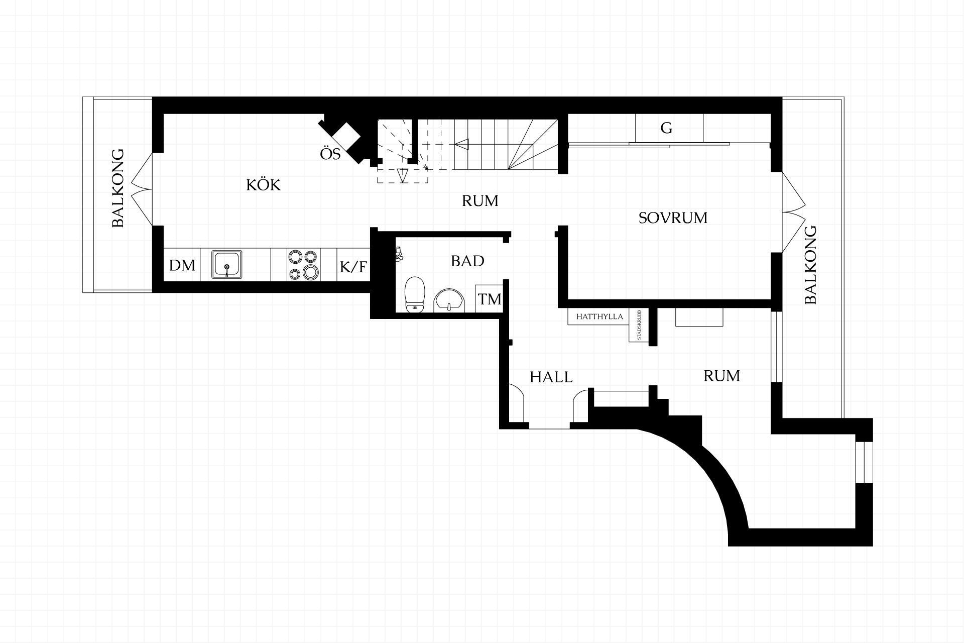 Planlösningen är både social och funktionellt fördelad i två plan. På entréplanet bevaras detaljer i klassisk 1920-talsstil med högt till tak, spegeldörrar, fina snickerier och fönsterpartier med spröjs. Det stilrena och sällskapsvänliga köket med vacker öppen spis, matplats för många sittande och utgång till den mindre terrassen. Köket smälter naturligt in med ett inre rum där trappa till övre plan finns, medan de två sovrummen ligger avskilt mot gårdssidan. "Master bedroom" med bra förvaring, plats för dubbelsäng och utgång till den större terrassen samt ett utmärkt barn-, tonårs- eller arbetsrum. I övrigt finns en välkomnande hall med plats för ytterkläder och ett helkaklat badrum med dusch, toalett, handfat, badrumsskåp samt tvättmaskin.