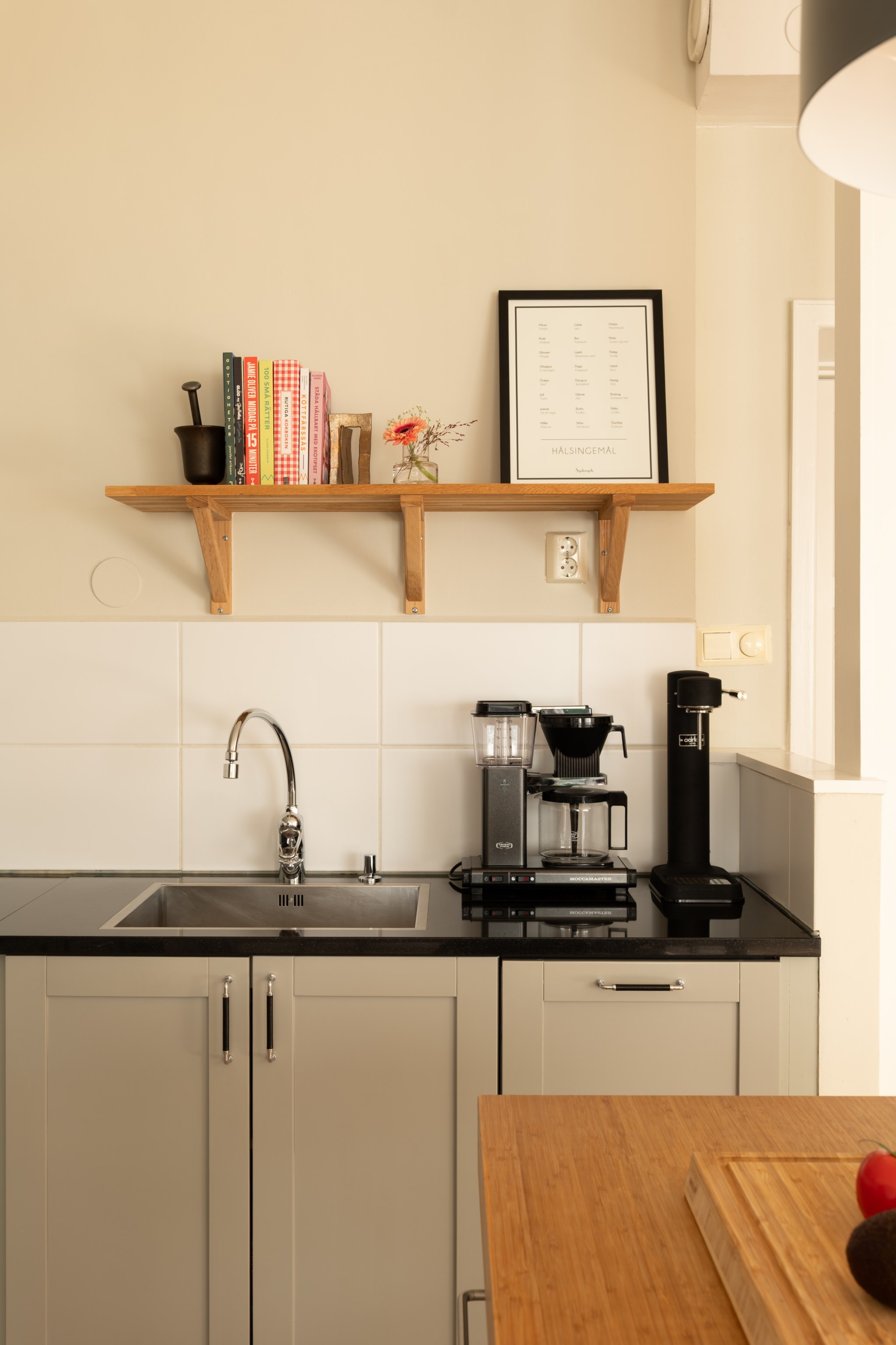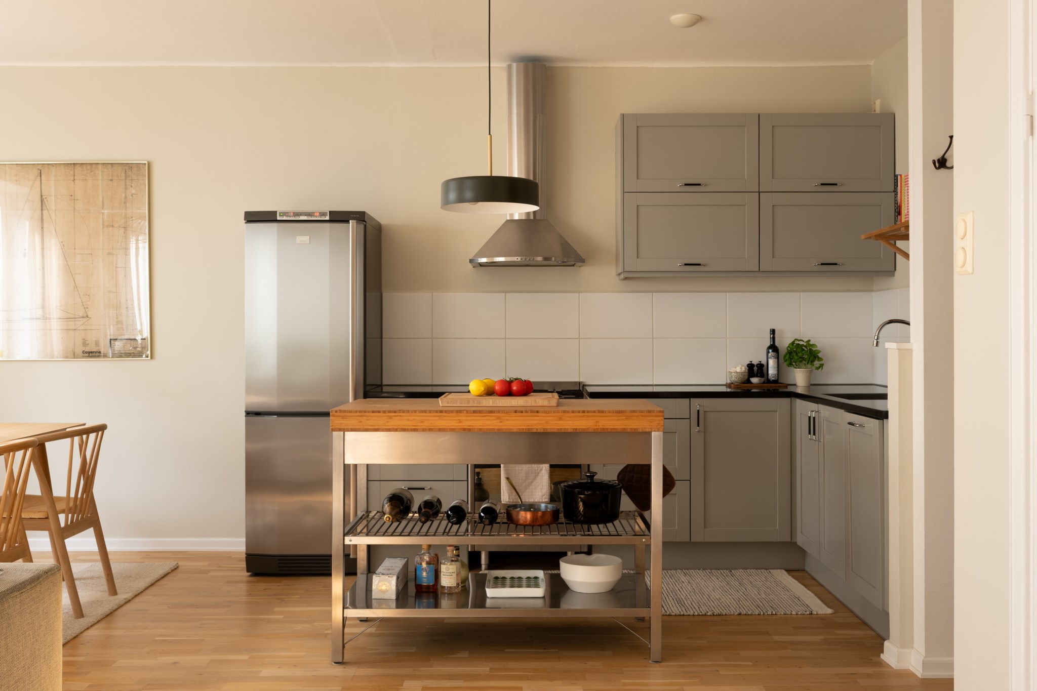 Stilrent och snyggt kök med gott om förvaring bakom gråa skåpluckor. Här finns gott om arbetsyta för den matlagningsglade. Köket är utrustat med gasspis, ugn, kyl/frys och diskmaskin. Öppen planlösning till matplats och vardagsrum.